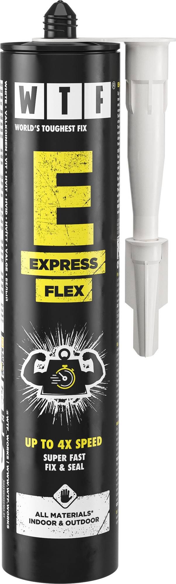 WTF montaažiliim Express Flex White sobib enamike tüüpiliste ehitusplatsi või kodutööde jaoks, kus ei vajata suurt painduvust ning segi kiire tempoga tööstusliku montaaži jaoks. Kuni 4x kiirem kõvenemine kui enamikel tüüpilistel liimhermeetikutel. Nakkub tugevasti kõigi tavaliste ehitusmaterjalidega. UV-kindel, eriti kõrge kemikaalide ja merevee kindlus. Kleepub ka märja pinnaga, isegi vee all. Sobib loodusliku kivi, puidu, betooni, klaasi, peegli, plastiku jaoks. Ei sobi PP-, PE, PTFE ega bituumeni jaoks.