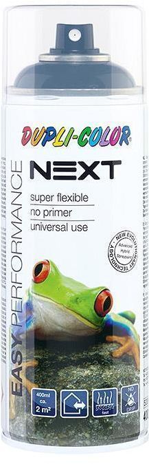 Dupli Color Next läikiv aerosoolvärv on valmistatud alkoholi baasil. Meeldiv keemilise lisandita lõhn. Lihtne kasutada - universaalne sobivus teiste värvidega (akrüül ja alküüd). Täiuslik nakkumine paljudel pindadel ilma krundita. Sobib ka kandmiseks otse vahtpolüstüroolile. Ühtlane pihustamine ja elegantne värvi tasandumine. Kiire kuivamine ja täiuslik katvus. Sobib kasutamiseks sise- ja välistingimustes. Painduv värvikiht, millel on hea kriimustuskindlus. Biolagunev lahusti kasutajasõbralikuks kasutamiseks. Katvus: 400 ml umbes 2 m². Kuivamisaeg 20°C juures: Tolmukuiv 10 - 20 min. Puutekuiv 45 min. Ülevärvitav umbes 2 h. Kuivamisaeg sõltub temp. ja õhuniiskusest. Töötemperatuur +10 -25°C. Alküüdvärvile kantuna, kuivab umbes 1 nädal.