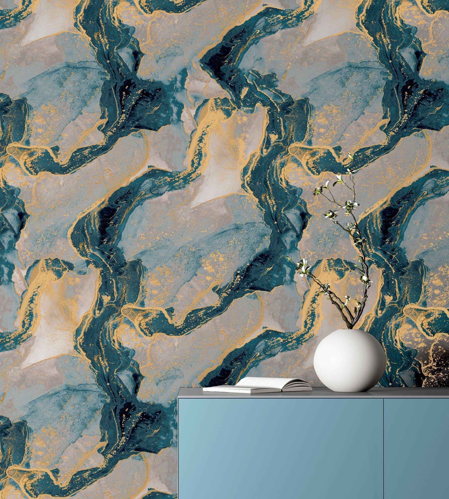• Tapeet Abstract Marble Teal/Gold.