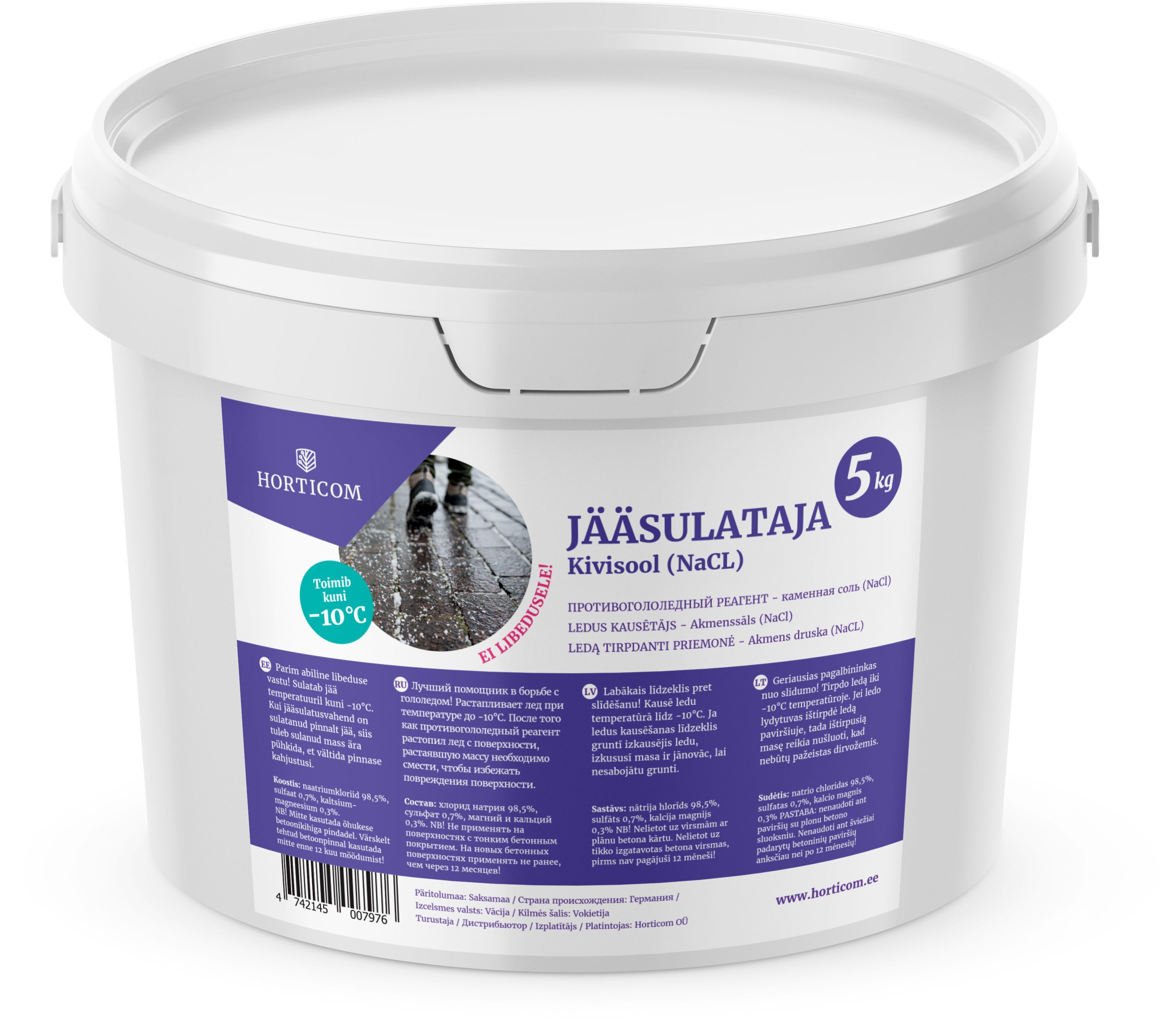 Horticom jääsulataja sulatab jää temperatuuril kuni -10°C. Kui jääsulataja on sulatanud pinnalt jää, siis tuleb sulanud mass ära pühkida, et vältida pinnase kahjustusi. Mitte kasutada õhukese betoonikihiga pindadel. Värskelt tehtud betoonpinnal mitte kasutada enne 12 kuu möödumist. Põhilised koostisosad: naatriumkloriid 98,5%, sulfaat 0,7%, kaltsium magneesium 0,3%.