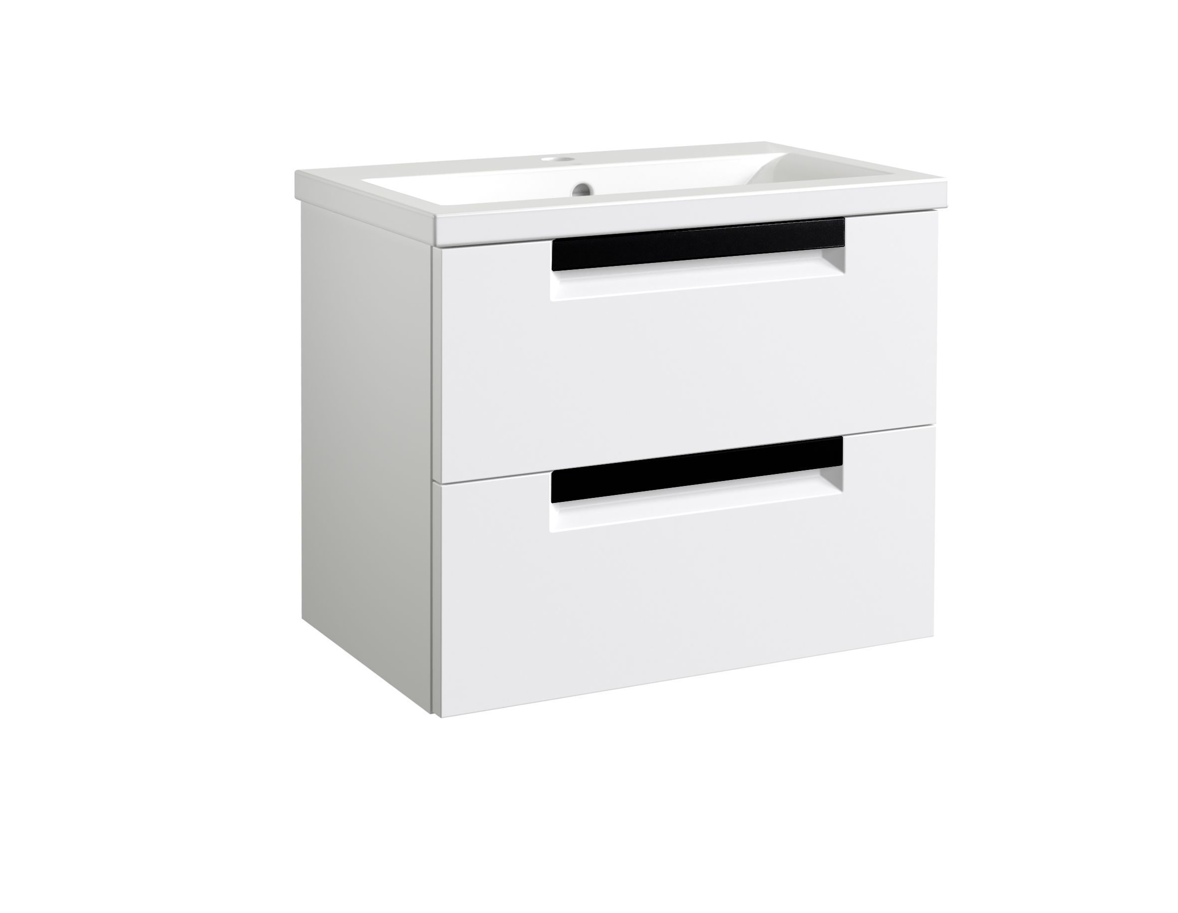 RB Bathroom valamukapp Milano on mõõtmetega 60 x 50 x 39. Kapil on 2 sahtlit ja mustad käepidemed. Valamukapp on koos valamuga. Värvus on matt valge.