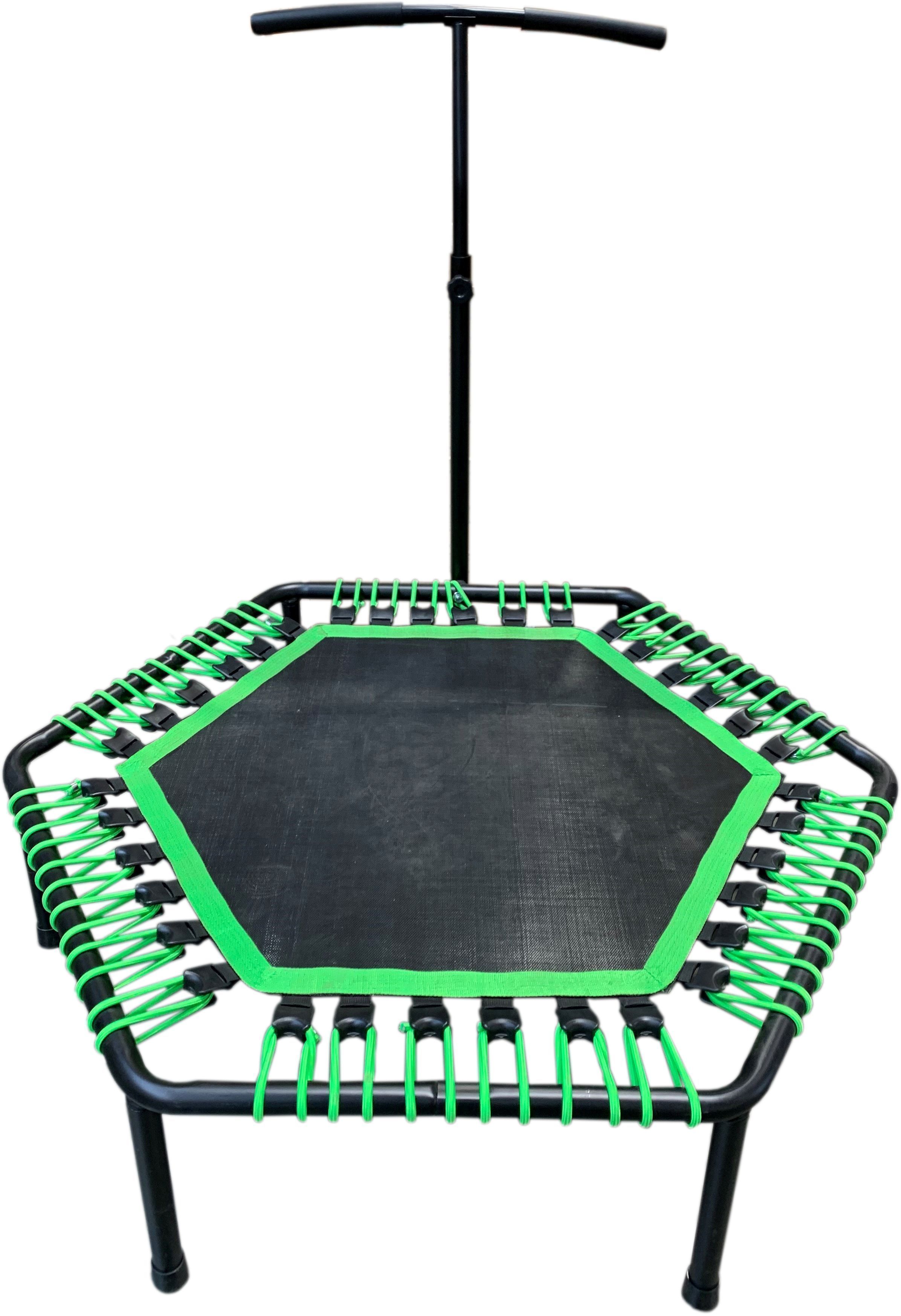 Kuusnurkne käepidemega batuut on mõõtmetega 120 x 105 x 130 cm.