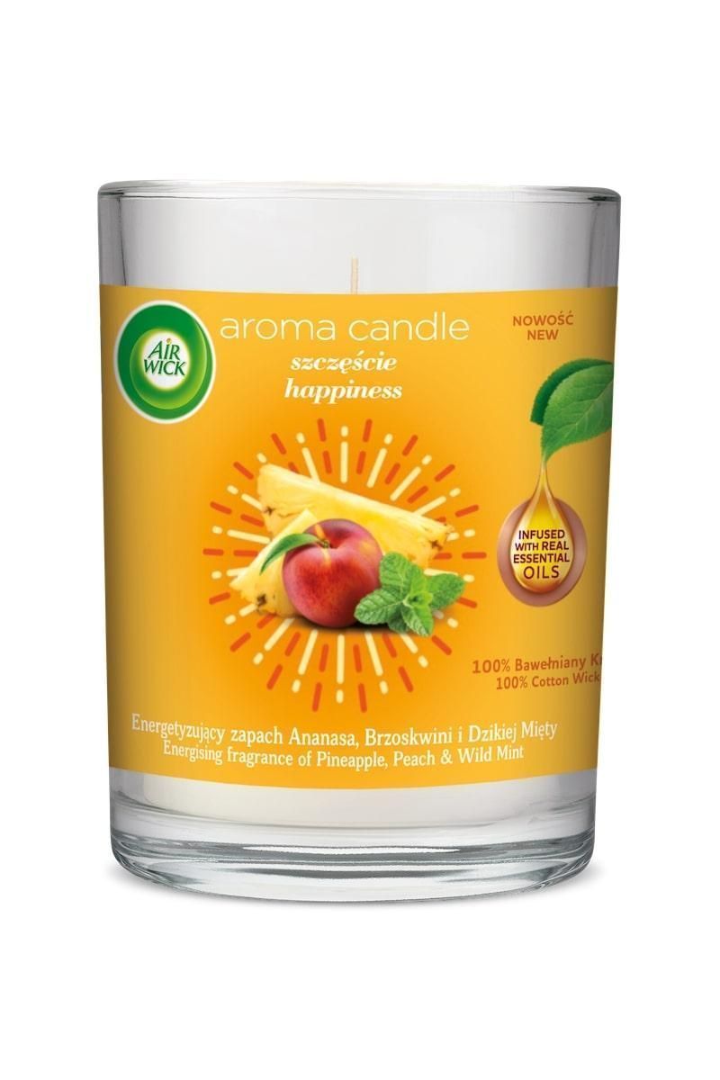 Air Wick lõhnaküünal Happiness. Rikastatud ehtsate eeterlike õlidega. Taht on valmistatud 100% puuvillast, metallivaba. Elustav lõhn ananassi, virsiku ja metsiku piparmündiga. Põleb kuni 40 tundi. Avastage Air Wick lõhnaküünlad looduslike eeterlike õlidega, mis loovad teie kodus meeldiva atmosfääri. Imeline aroom kogu põlemisaja jooksul. Sisaldab: etüüllinalool, allüültsükloheksüülpropionaat.