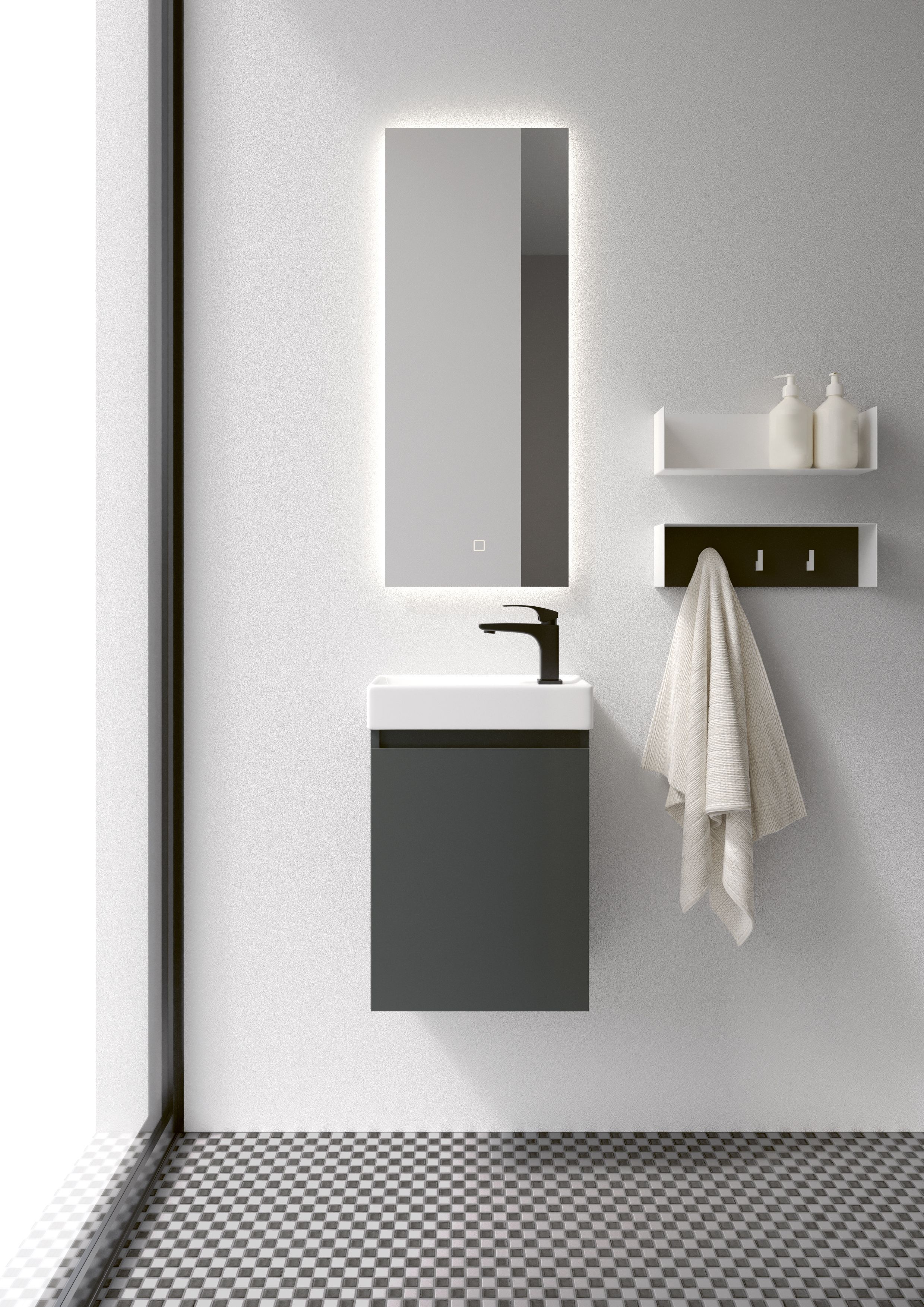 KAMĖ Mini 40 valamukapp parempoolse kapiga. Kapp on mõõtmetega 21,3 x 39 x 50 cm. Värvus on grafiit.