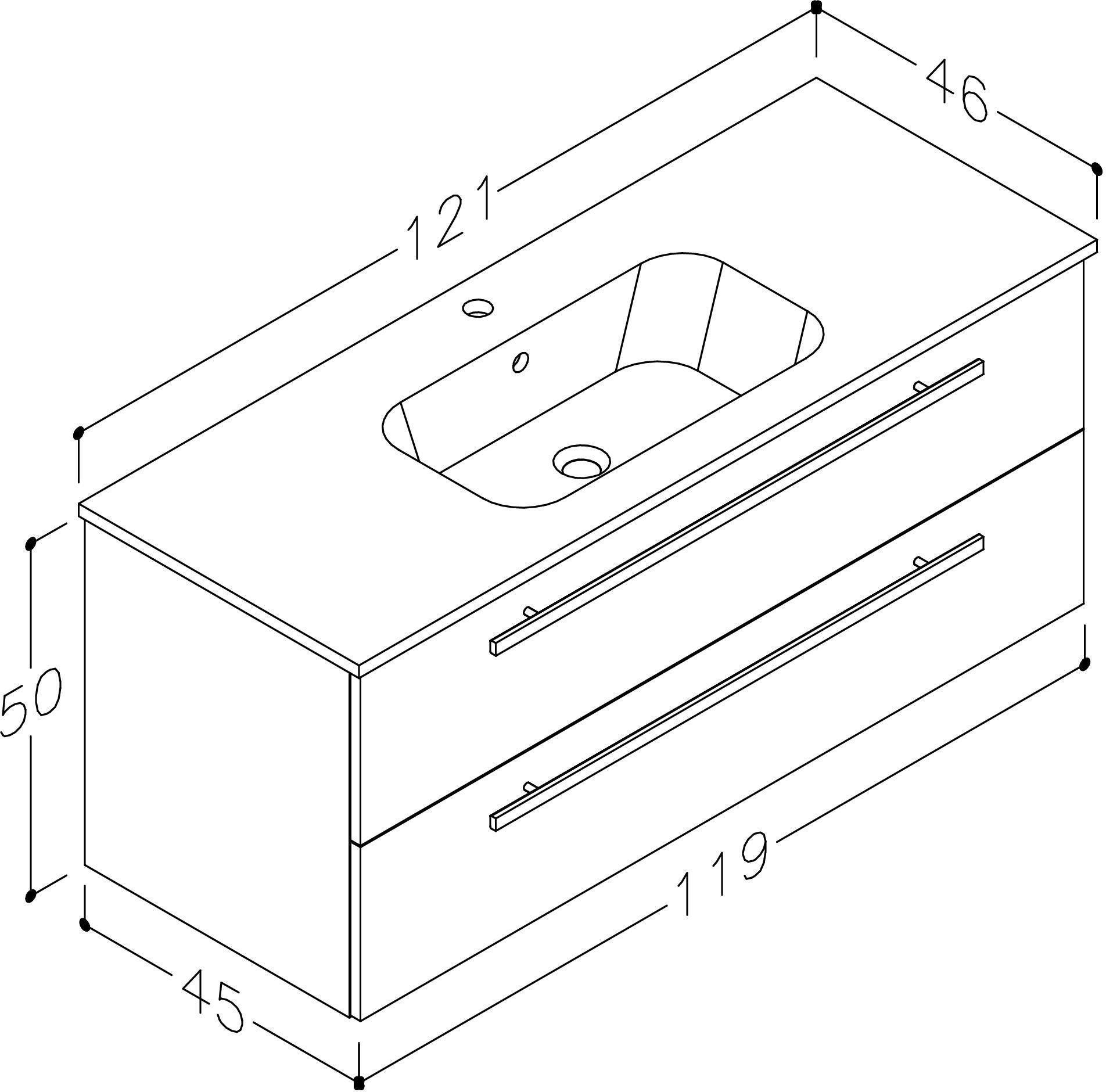 RB Bathroom Serena 121 valamukapp koos valamuga on mõõtmetega 45 x 118 x 50 cm. Kapp on halli värvi.