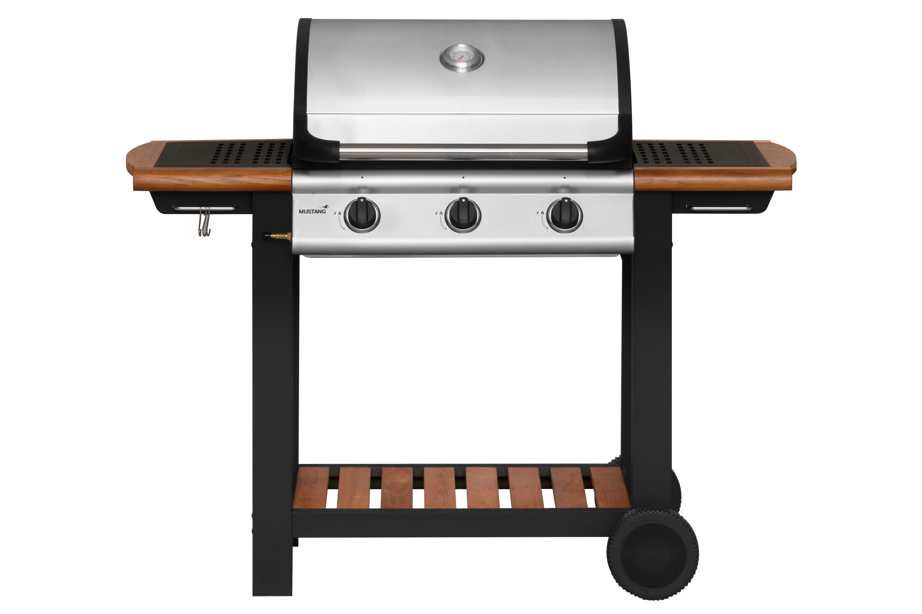 Mustang gaasigrill Greenville 3 kolme põletiga, mis on valmistatud malmist. Koguvõimsus on 10,5 kW. Grillipind on 63 x 41 cm. Grillrest 31 x 41 cm ja grillplaat 31 x 41 cm on valmistatud matt emailitud malmist. Soojendusriiul on valmistatud kroomitud traatterasest niing on mõõduga 61 x 14 cm. Grilli puitosad on valmistatud vastutustundlikult kasvatatud puidust. 2 tk alumiiniumiga kaetud terasest leegitaltsutajaid. Piesosüüde on integreeritud igasse juhtnuppu. Kaas ja juhtpaneel on valmistatud 430 roostevabast terasest. Raam on valmistatud pulbervärvitud terasest. Küttekolde all on tsingitud rasvaalus. 2 tk suured rattad hõlbustavad grilli käsitsemist.
