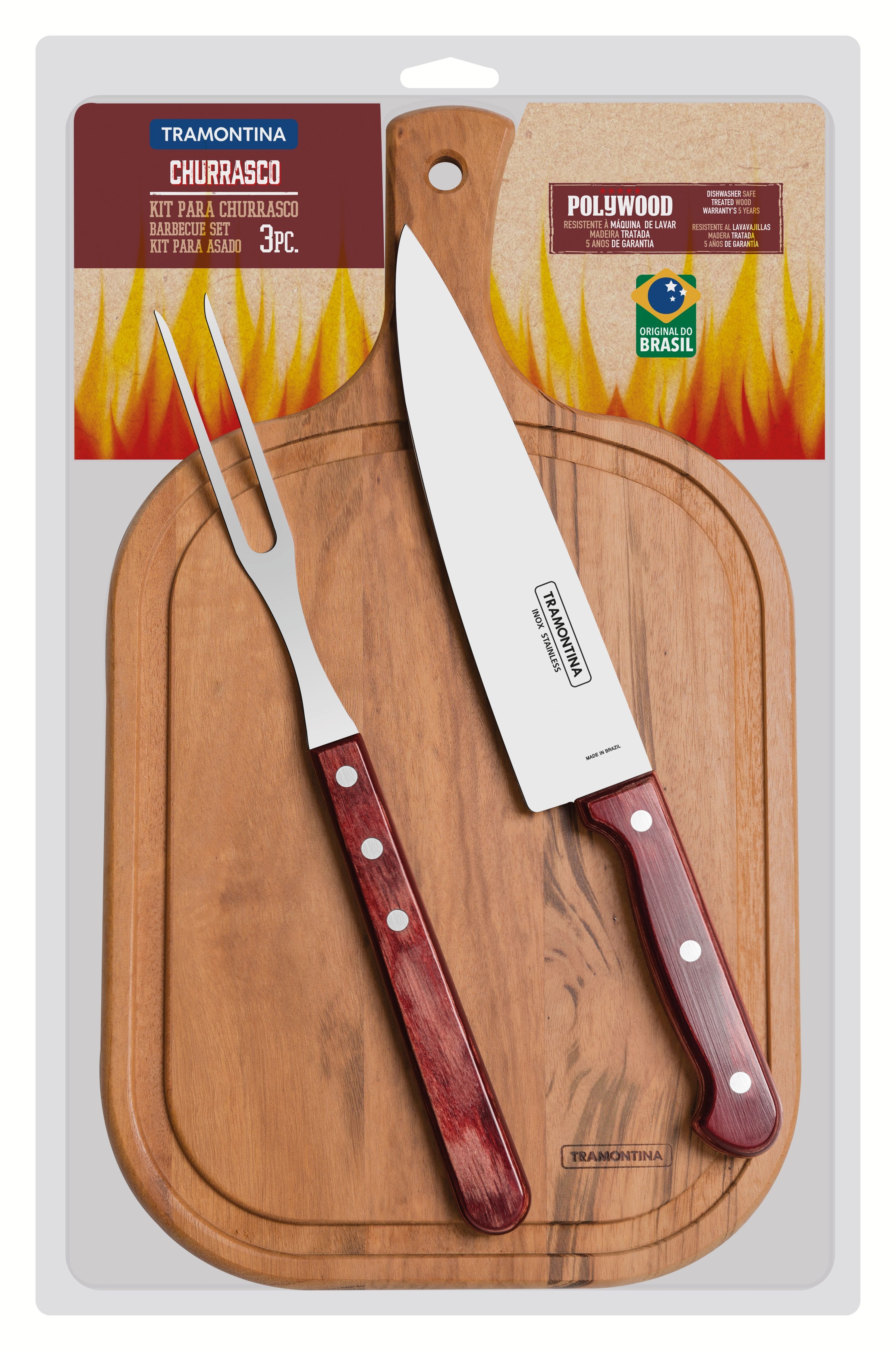 • Grillikomplekt koosneb roostevabast terasest teradega ja polüpuidust käepidemtega noast, lihakahvlist ja lõikelauast.