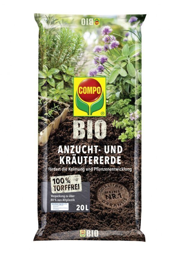 Compo BIO turbavaba orgaaniline külvi- ja maitsetaimemuld. Sobib maitsetaimede seemnete külviks ja ümberistutamiseks. 100% looduslikest taastuvatest koostisosadest maitsetaimemuld sisaldab kvaliteetset kompostmulda, puidukiudu, kookosturvast ning on rikastatud sarvejahu ning sõnnikuga. Muld on neutraalne, õhulise struktuuriga, hea veeimamis-võimega, sobides seega hästi maitsetaimede kasvatamiseks.Koostis: NPK : lämmastik (N) 50-300mg/ l; fosfor (P2O5) 80-400 mg/ l; kaalium (K2O) 300-1100 mg/ l; pH 5,0-7,0 (neutraalne). Orgaaniline osa: 30% puukoore kompost, 25% puidukiud, 25% kookosturvas, 20% taimekompost, 1,2 kg/m³ sarvejahu, 1 kg/m³ merelindude sõnnik. Soovitused: Parim külvi-ja ümberistutamise aeg on kevadel, taimekasvu alguses. Pärast külvamist/ istutamist kastke korralikult ja kaitske otsese päikese eest! Regulaarset väetamist alustage 4 - 6 nädala möödudes. Hoida kuivas, jahedas ja varjulises kohas. Läbikülmumine ei muuda mulla struktuuri.