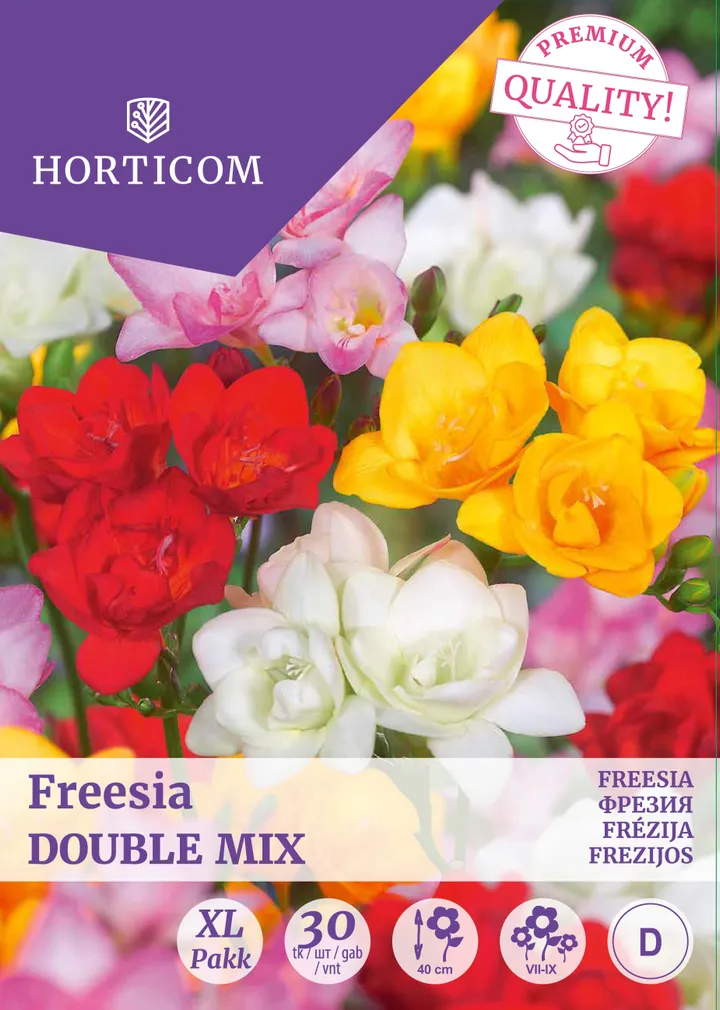 Freesia Double Mix õied on erinevates värvides Freesiad on väga head lõikelilled, mis püsivad nii vaasis kui ka peenral kolm nädalat. Istutage sibulad kuiva päikeselisse kasvukohta, vajadusel taluvad nad ka poolvarju. Eelistatuim kasvumuld võiks olla huumusrikas ja vett hästi läbilaskev, ei sobi kohad, kuhu jääb pikalt seisma vihma- või kastmisvesi ning muld on raske ja tihke. Freesiad ei ole täielikult külmakindlad, seega kaevake need sügisel välja, kui taimed muutuvad kollaseks või pärast esimest öökülma. Lõigake varred 2 cm pikkuseks ja puhastage need mullast. Säilitage sibulaid turbas või liivas jahedas ja kuivas kohas.
