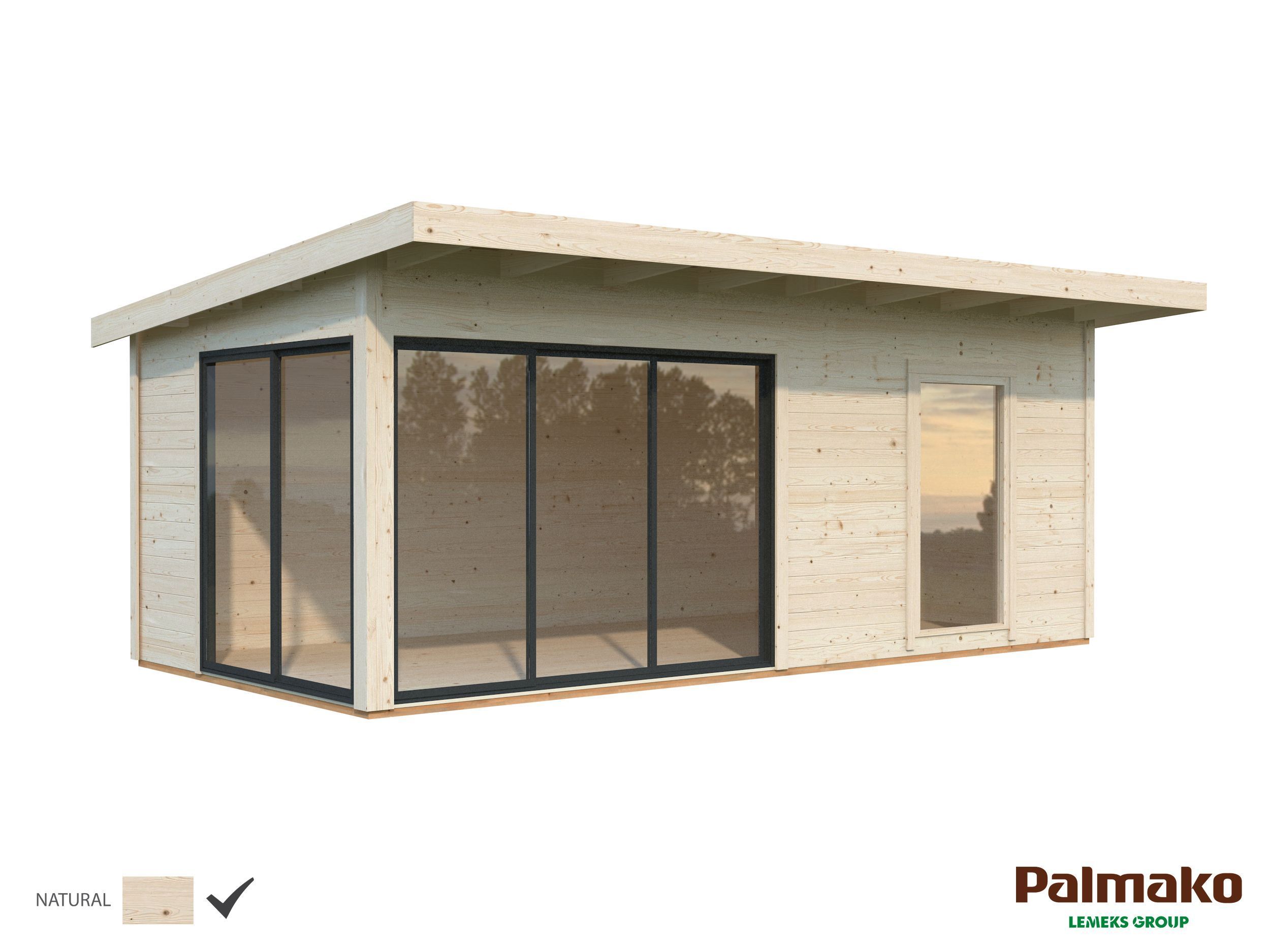 Aiamaja Palmako Andrea 17,1 m² Slide Plus. Töötlemata freesprussist valmistatud lükandustega aiamaja. Ustel on karastatud pakettklaasid. Katusekattematerjal on lisatoode. Mõõtmed on 300 x 595 x 264 cm. Tarnitakse detailidena, mitte kokkupanduna.
