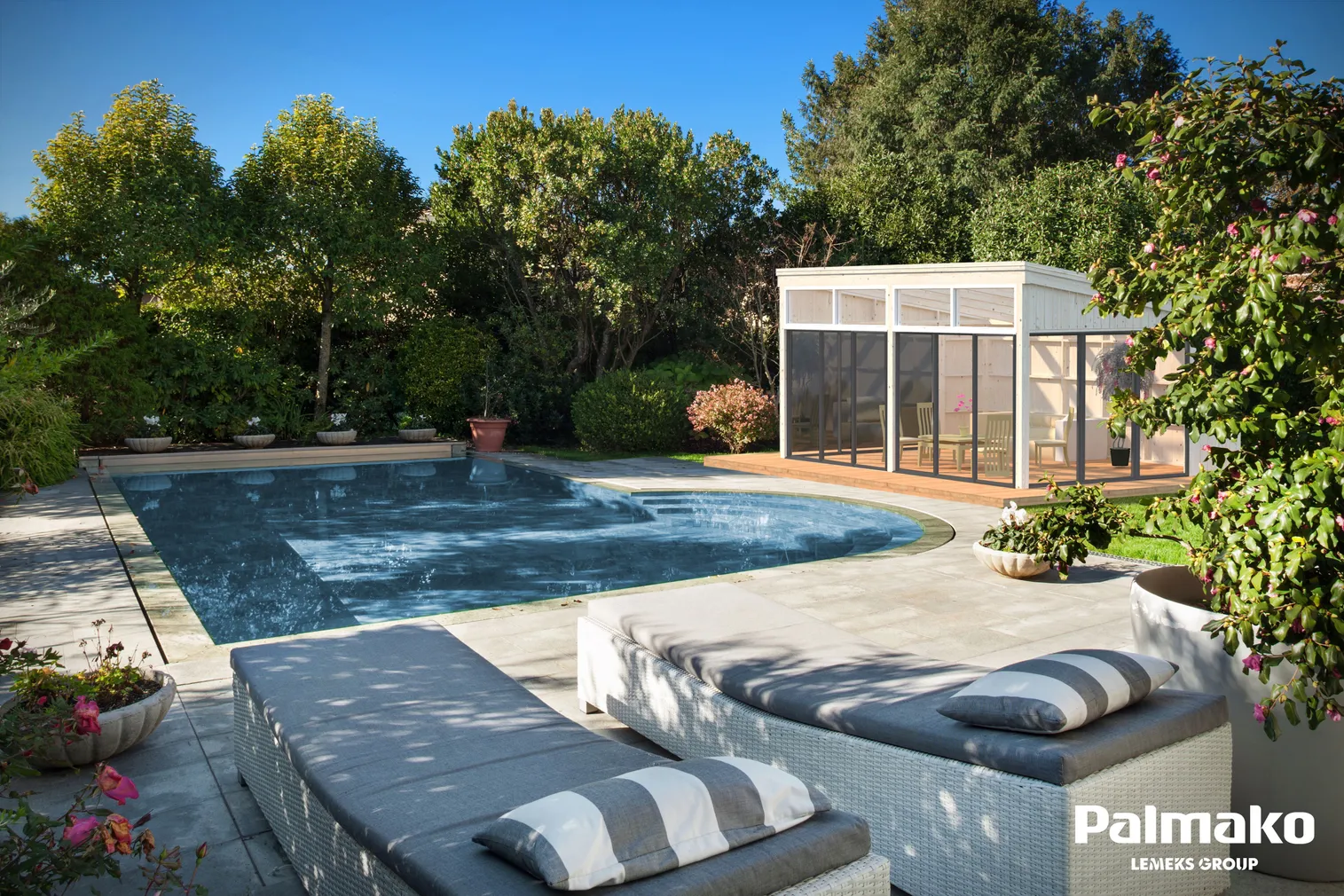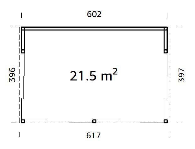 Naturaalsest puidust paviljon lükanduste ja polükarbonaatkihtplastikust katusega. Terrass/põrand ei ole valikus. Mõõtmed on 396 x 602 x 290 cm.