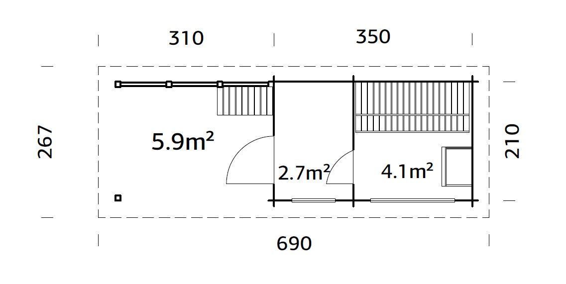 Palmako Sanna 6,8+5,9 m² Töötlemata freesprussidest saunamajake. Mõõtmed on 250 x 650 x 249 cm.