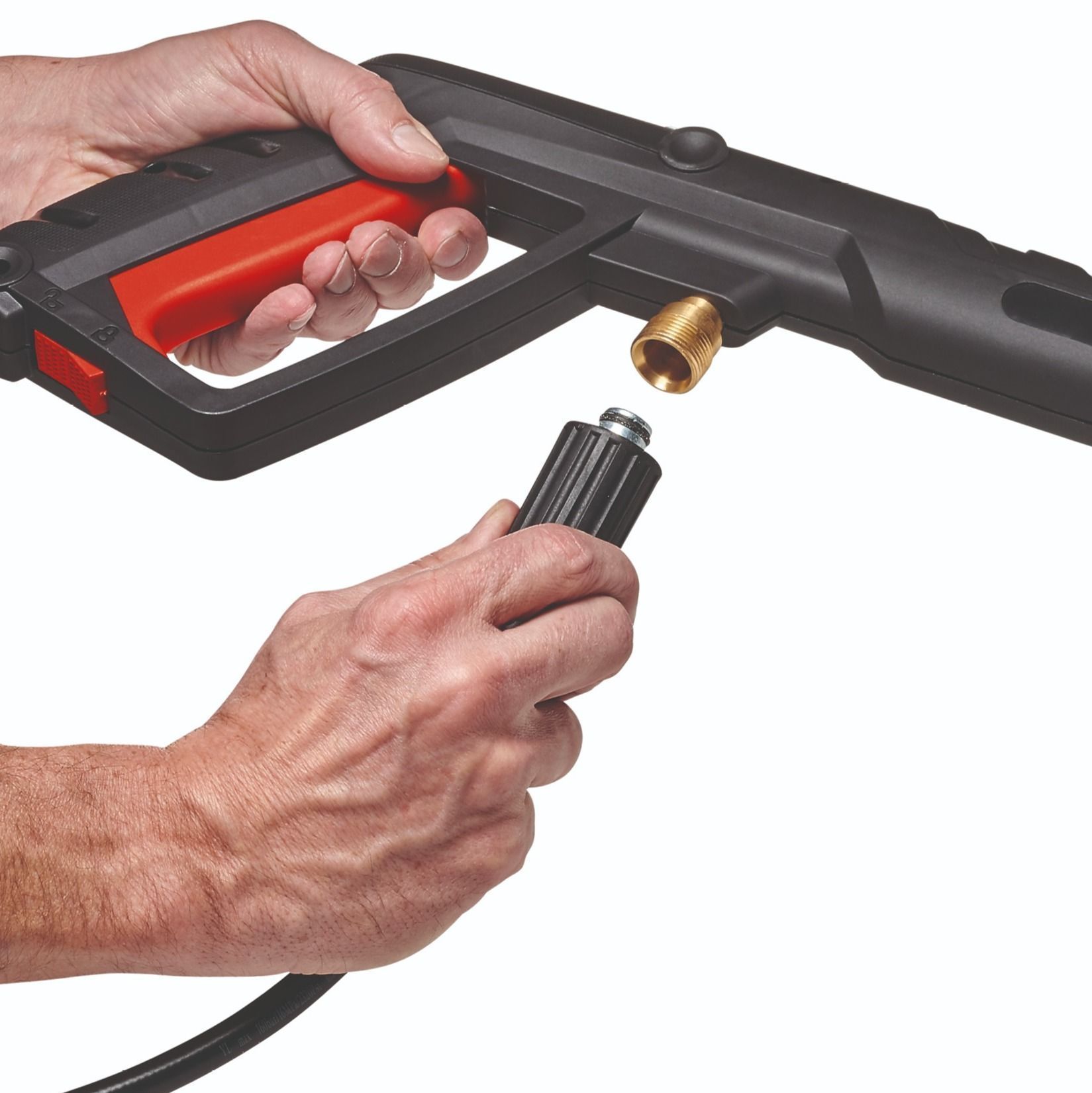 Komplektis püstol, 5m survevoolik, toru ja seadistatav otsak (punkt/lai), pöörlev otsak, hari, vahutekitaja ja terrassipesuhari.