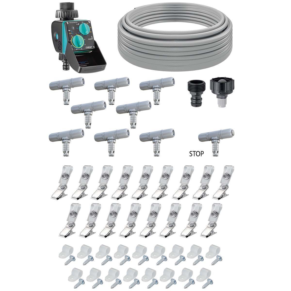 • Komplekti kuulub: 12 m peatoru, 9 udutus sprinklit, kahte sorti kinnitusklambreid (vedru klambri, kruvi klambrid), ühendused (ühendamaks peatoru veevõrguga) ja taimer.