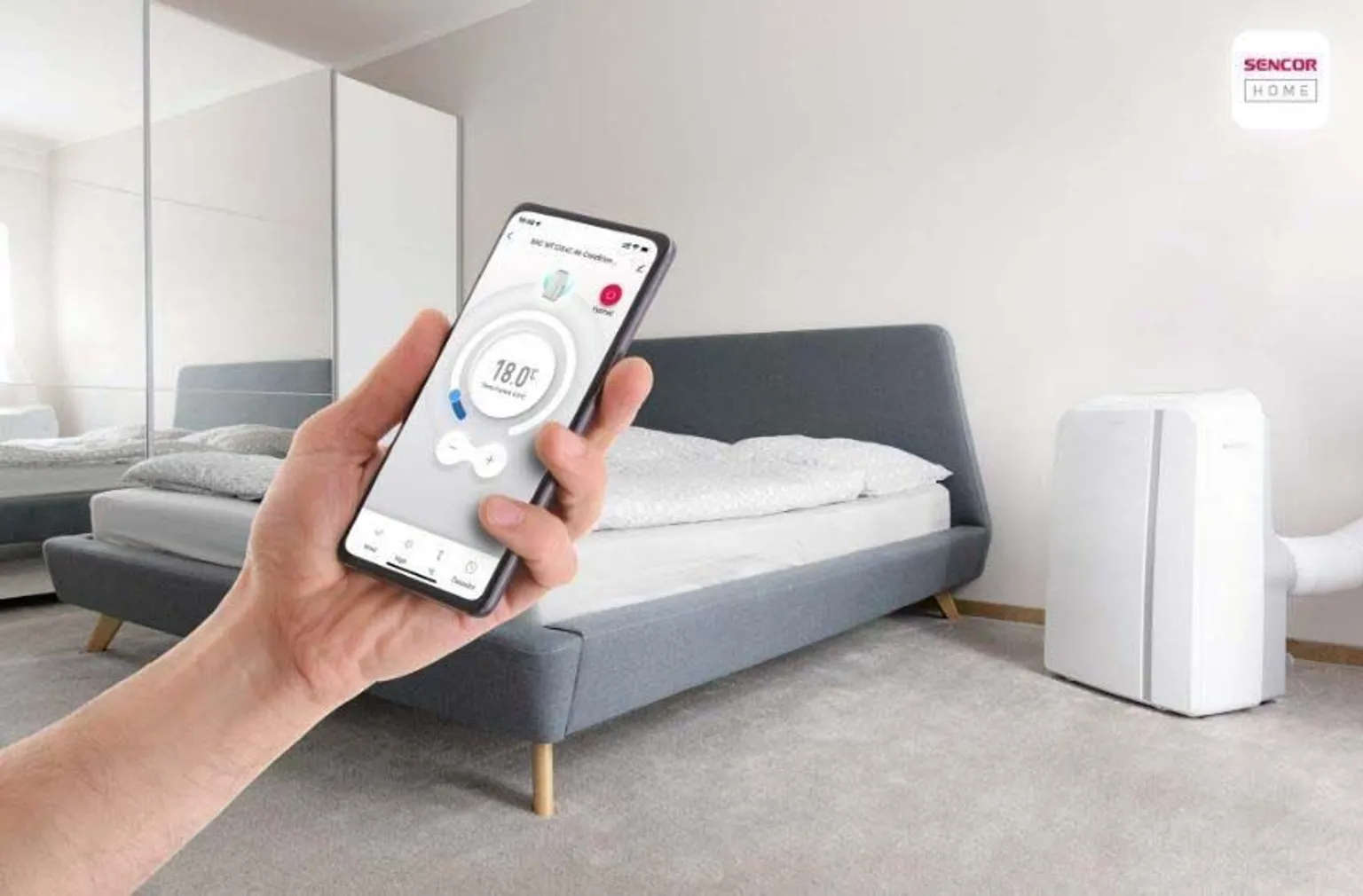 Konditsioneer Sencor SACMT1240C, mille jahutusvõimsus on 12 000 BTU/h, sobib kuni 47 m² ruumidele. Seade on Wi-Fi ühilduv ja sellel on puutetundlik LED juhtpaneel ning kaugjuhtimispult. Konditsioneeril on neli kiirusastet.