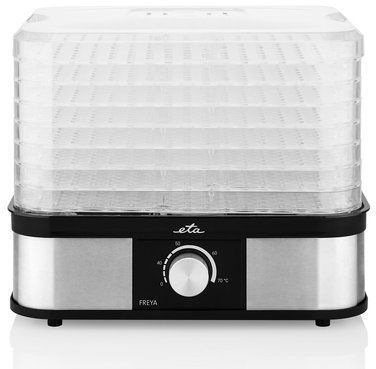 ETA FREYA toidukuivatajaga saate kuivatada puuvilju, köögivilju, seeni, liha ja ürte. Pakendis on 5 kuivsõela, millel erinevat tüüpi toiduained kuivatatakse ja spetsiaalne ürdisõel. Temperatuuri saab seadistada vahemikus 40-70 °C.