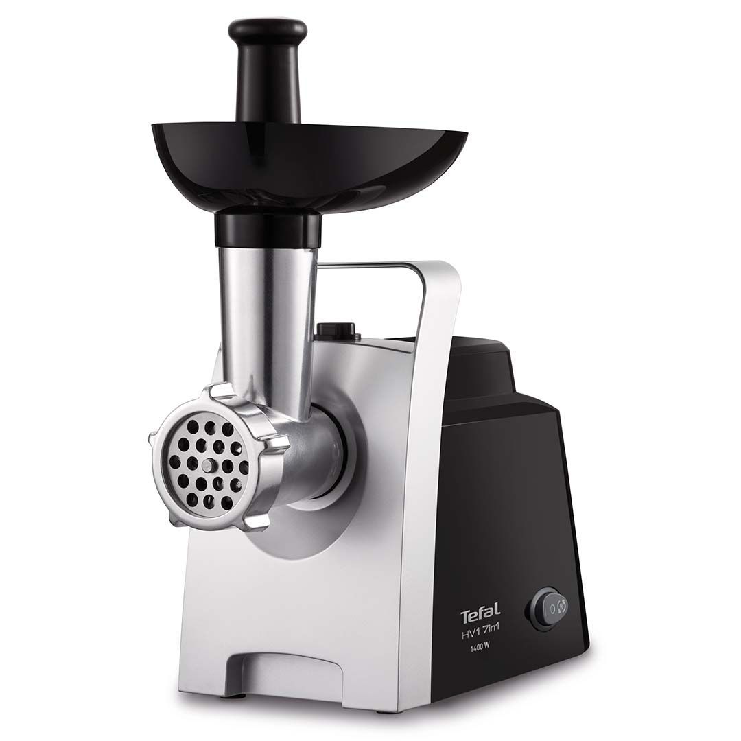 Tefal HV1 hakklihamasin koguvõimsusega 1400 W. Vaatamata oma kompaktsusele, hakib HV1 tänu suurele võimsusele kuni 1,7 kg liha minutis. Tagurpidi funktsioon võimaldab hakkida ka kõige kõvemaid koostisosi. Komplektis on 3 trumlit (jämedaks ja peeneks riivimiseks ja viilutamiseks), 3 roostevaba terasest võre liha hakkimiseks(peenelt ja jämedalt hakkimiseks) ja vorstide valmistamise otsik.Tefali hakklihamasin on kohustuslik abivahend liharoogade ja salatite valmistamisel. See saab hakkama ka kõige kõvemate toiduainete hakkimisega. Viiluta köögivilju, valmista koduseid vorstikesi, salateid ja veel palju muudki selle efektiivse ja kompaktse hakklihamasinaga.