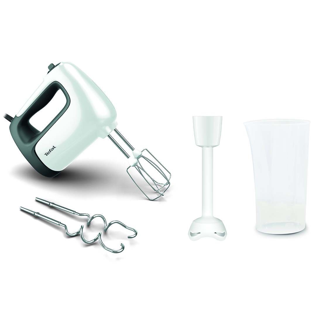 Tefal käsimikser saumikser, millel on võimas 500 W mootor ja 5 kiirust + turbofunktsioon. Komplektis on 2 visplit, 2 taignakonksu, plastikust saumikseri otsik, segamisnõu. Lisatarvikud (visplid, taignakonksud) on nõudepesumasinas pestavad. Vabastusnupp lihtsaks tarvikute eemaldamiseks. Võimsa 500 W mootoriga saad kasutada viit erinevat kiirust ja turbonuppu, et leida valmistatava toidu jaoks sobiv kiirus. Metallvisplitega saad vahustada munavalgeid, vahukoort või segada koogitaigent. Taignakonksud võimaldavad segada leiva- või pitsataigent. Saumikseri otsik võimaldab valmistada mõne hetkega suppe, püreesid ja veel palju enamat.
