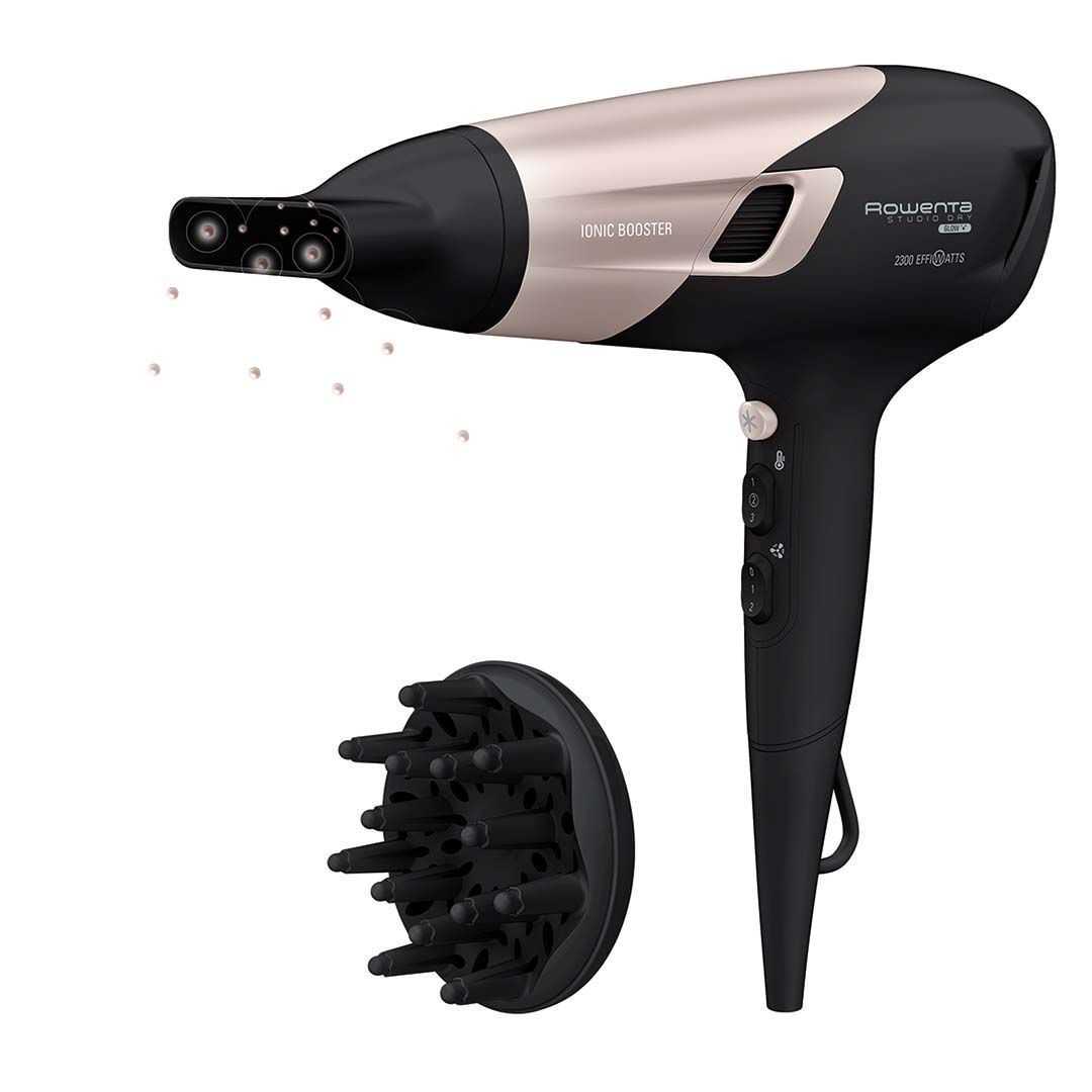 Rowenta Studio Dry Glow föön on koguvõimsusega 2100 W. Föönil on kiirused: 2, temperatuuride arv: 3, otsikud: difuusor, õhku koondav otsik.