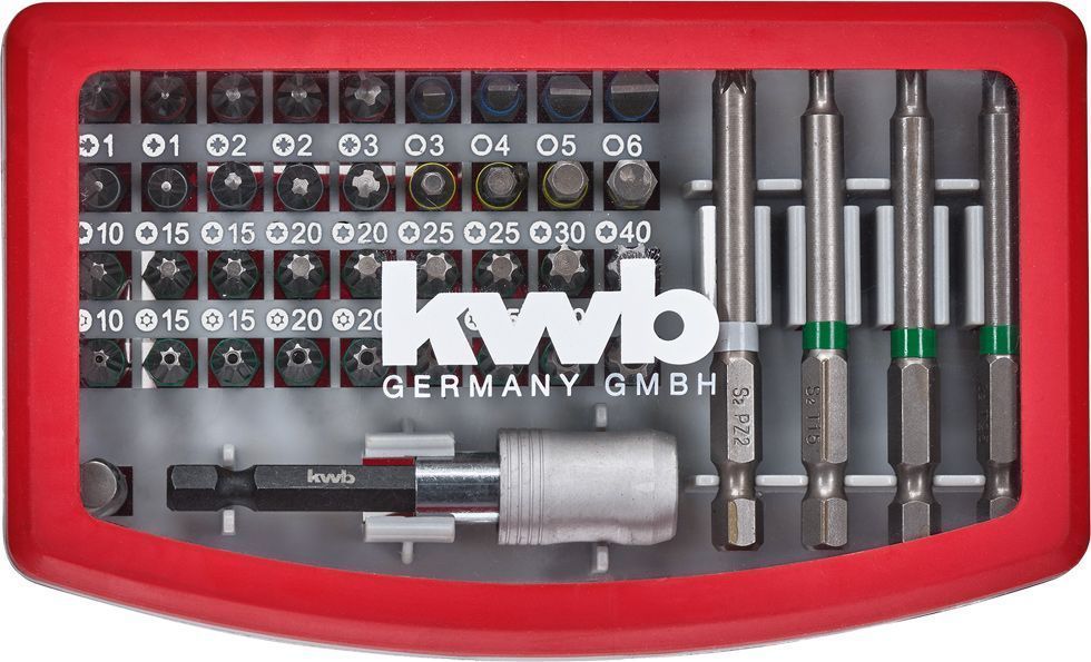 42-osaline vööklambriga otsikukomplekt kwb-lt sisaldab 36 25 mm otsikut C 6.3 varrega ja neli 70 mm otsikut E 6.3 varrega kõige tavalisemates ajamites. Kõik otsikud on valmistatud liivapritsitud S2 terasest. Eriline esiletõst on 60 mm kiirvahetusega otsikuhoidik, mis on valmistatud vastupidavast kroomvanaadiumist, tugeva magneti, kuuskantpesa ja E 6.3 varrega. 1/4 tolline kuuskantadapter, mis on valmistatud liivapritsitud kroomvanaadiumist, täiendab otsikukomplekti. Kruvikeeramisriist on hoiustatud praktilises kwb disainiga otsikukarbis ja sobib kõigile standardsetele löökmutrikeerajatele, akutrellidele ja trellidele.