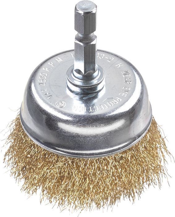 Rooste eemaldamine, puhastamine, mattviimistlus ja värvi, katlakivi ja mustuse eemaldamine metallilt ja kivilt. Läbimõõt 50 mm, kortsutatud messingtraat, korrosioonikindel, paksus 0,2 mm, E6.3 kuuskantvars. Eriti sobiv peentöödeks, keskmise suurusega pindadele.