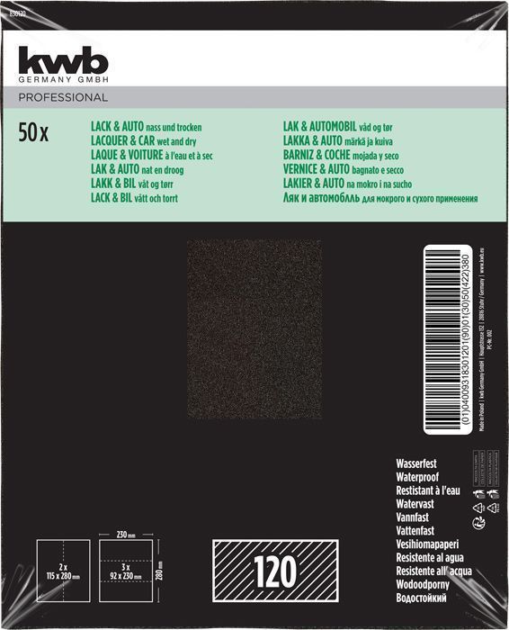 Kwb lihvpaber, mõõtmetega 230 x 280 mm, sobib värvi ja auto töötlemiseks. See veekindel lihvpaber on eriti paindlik ja kõrge eemaldusmääraga, pakkudes pika kasutusea. Ränikarbiidkattega paber on eriti peene teraga, ideaalne kere lihvimiseks ning sünteetilise vaigu, laki, värvi, klaasi, kivi, plasti ja metalli töötlemiseks.