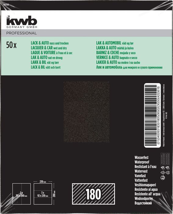 Kwb lihvpaber, mõõtmetega 230 x 280 mm, sobib värvi ja auto töötlemiseks. See veekindel lihvpaber on eriti paindlik ja kõrge eemaldusmääraga, pakkudes pika kasutusea. Ränikarbiidkattega paber on eriti peene teraga, ideaalne kere lihvimiseks ning sünteetilise vaigu, laki, värvi, klaasi, kivi, plasti ja metalli töötlemiseks.