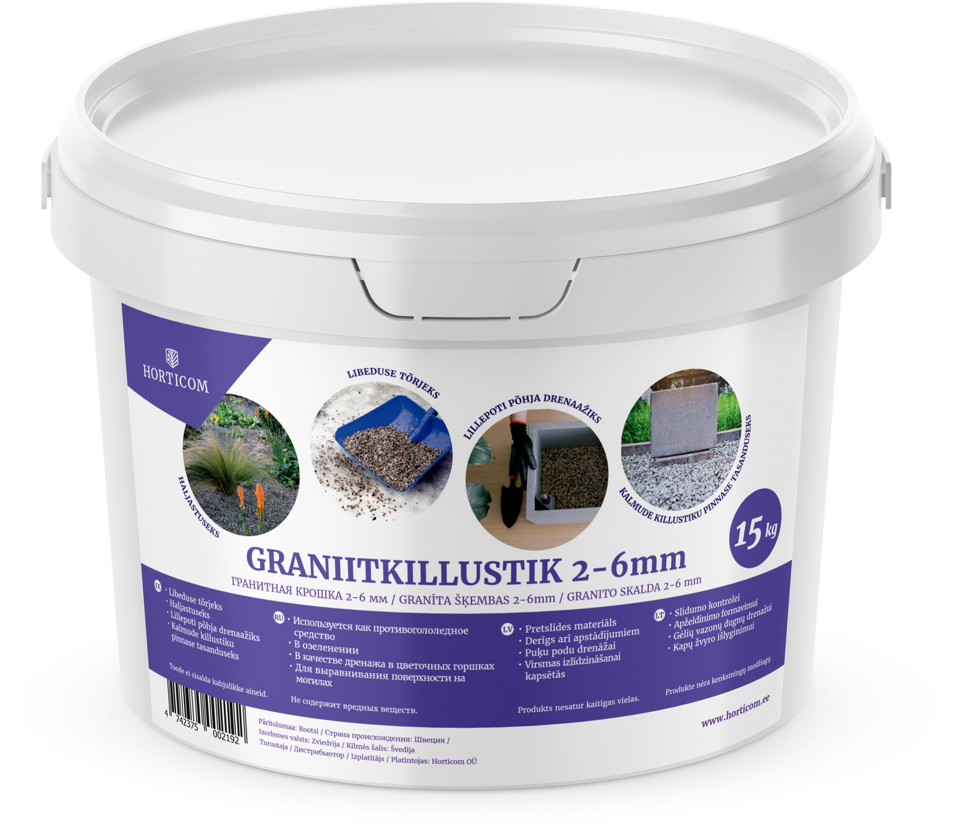 Horticom graniitkillustik. Kasutatakse libeduse tõrjeks, haljastuseks, lillepoti põhjas drenaažiks, kalmude killustiku pinna tasandamiseks. Fraktsioon 2 - 6 mm. Toode ei sisalda tervisele kahjulikke aineid. Kogus 15 kg.
