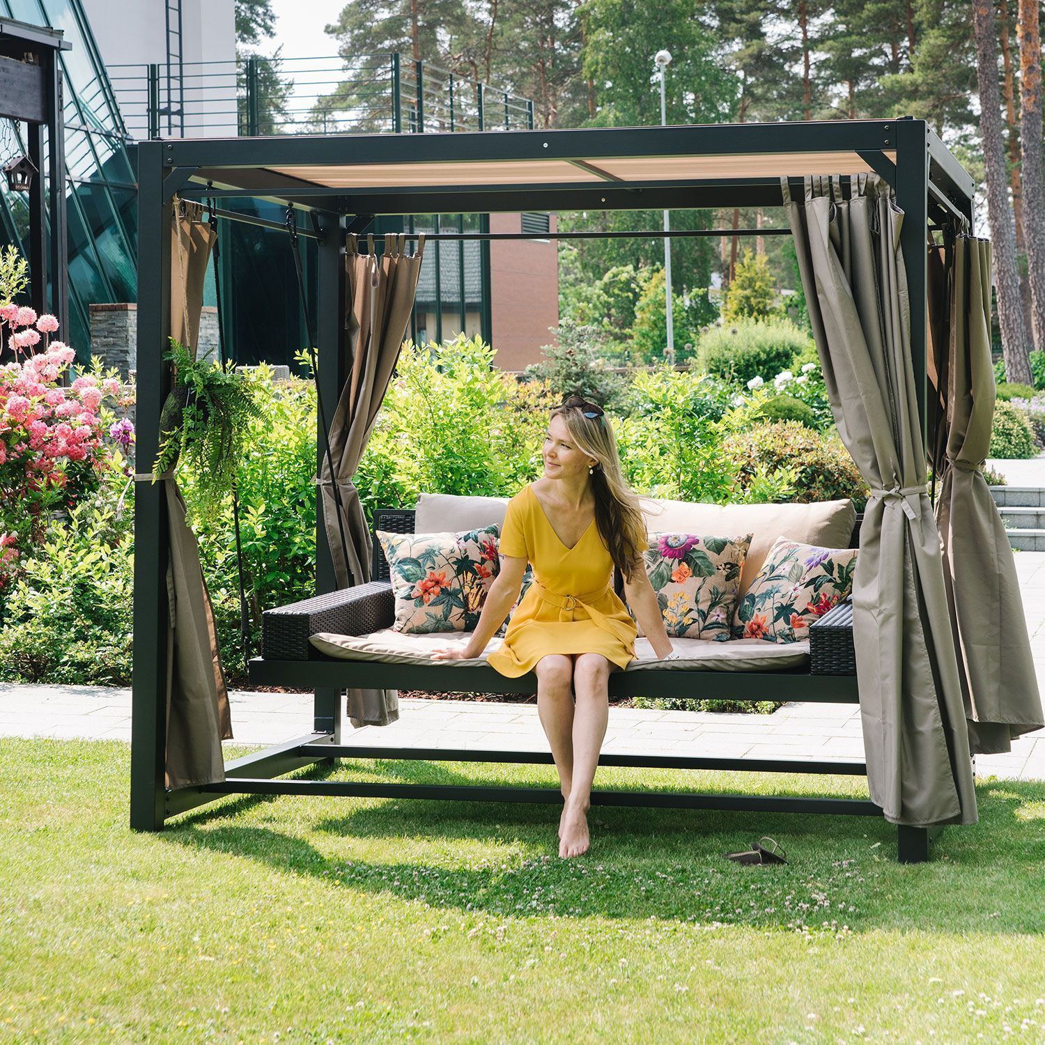 Kiik BARCELONA pruun 236x180xH210cm, pruun/beež. Naudi suve ja lõõgastu kodust lahkumata! Modernse disainiga, ruumikas aiakiik on suurepärane täiendus tavapärasele aiamööblile. Kiige tugev põhikonstruktsioon on valmistatud terasest ja viimistletud tumepruuni pulbervärviga. Polüesterkangast katus ja külgkardinad pakuvad mõnusat varju päikese eest. Istmepõhi on valmistatud textilene materjalist, mis laseb hästi õhku läbi, kuivab kiiresti ja on lihtsalt hooldatav. Istme seljatugi ja käetoed on kaetud pruuni plastikpunutisega. Komplekti kuulub 2 pehmet seljatoepatja 80x46x18cm ja alusmadrats 156x134x4cm. Patjade ja madratsi katted on valmistatud polüesterkangast. Terasraami tugiposti mõõdud on 80x80mm. Kiige istme üldmõõdud on 195x134xH48cm, käetoe laius 16cm, istme sisemõõdud 156x130cm, istmekõrgus maast 54cm. Kaalupiirang 200kg. Toode on muutlikes ilmastikutingimustes hästi vastupidav ja lihtsalt hooldatav. Kaitset ilmastikuolude eest vajavad ainult padjad ja varikatus. Välitingimustes kasutatava mööbli eluea pikendamiseks soovitame kasutada välimööbli katteid. BARCELONA kiigele on saadaval spetsiaalne kate koodiga 13250. Tugeva vihma korral jälgige, et katusele ei koguneks liigselt vett. HOIUSTAMINE: soovitame suvehooaja lõppedes kiik lahti monteerida ja hoiustada kuivas ning hea ventilatsiooniga ruumis.