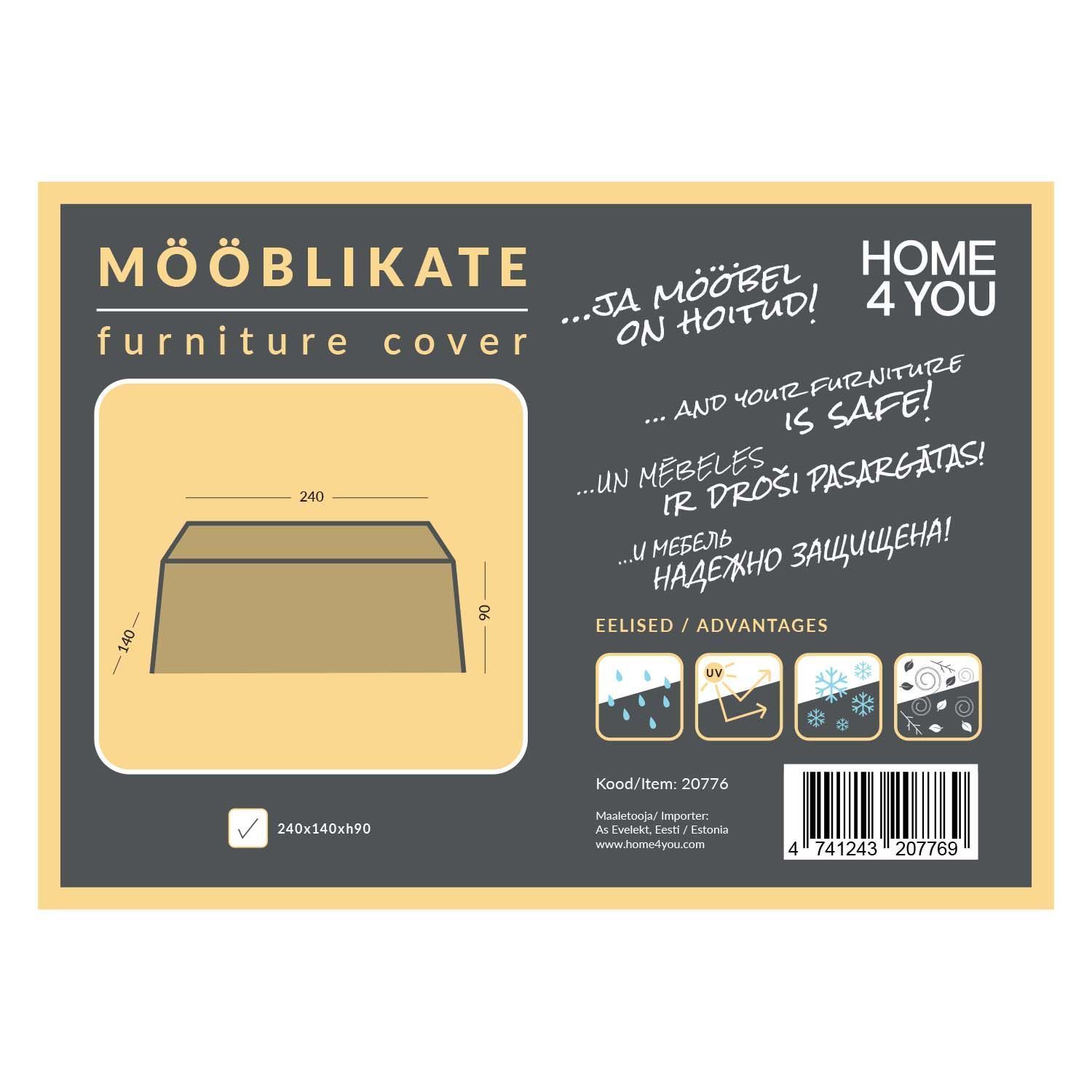 Mööblikate 240x140x90cm, ilmastikukindel. Mööblikate hoiab aiamööbli puhta ja kuivana ning alati kasutusvalmis. Mööblikate on valmistatud vetthülgavast lamineeritud polüesterkangast. Teibitud õmblused ei lase vett sisse ja õhuavad vähendavad aurude kondenseerumist katte all. Katte alumises servas on nöör, mille abil saab katte vajadusel kokku tõmmata ja kinnitada nii, et see püsib ka tugeva tuulega paigal. Materjali tehnilised andmed: kaal 155±8 g/m², paksus >0.20 mm, veekindlus ? 6000mm, vetthülgavus 4, värvi valguskindlus 6, UV kaitse 600 ± 5 tundi, hingavus 150-200 g/m²/24h, temperatuuri taluvus -30 kuni +80°C. TÄHELEPANU! Mööblikate aitab pikendada mööbli eluiga ning on turvaline kaitse välimööblile, kuid ei taga samasuguseid tingimusi nagu siseruumides hoiustamine. Tugeva vihma korral võivad kattega kaetud mööblile koguneda veelombid. Eemaldage kogunenud vesi esimesel võimalusel. Peske katet vastavalt tootele kinnitatud hooldusjuhendile. Mööblikatte kasutamine ei ole sobiv lahendus aiamööbli ületalve õues hoidmiseks.