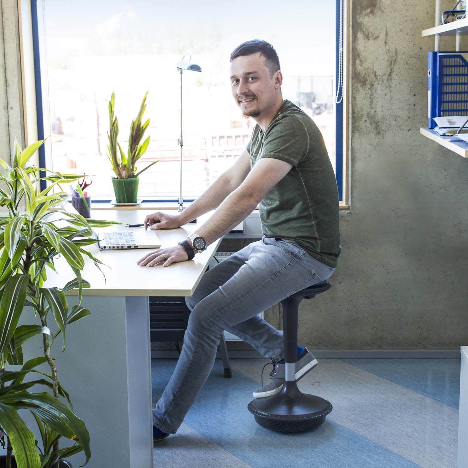 Pukktool JUST FUN hall. Mugav multifunktsionaalne tasakaaluiste pakub erinevaid kasutusvõimalusi. Pukktooli eeliseks kontoritooli ees on see, et pukktoolil istudes hoiab inimene õiget rühti ning treenib samal ajal selja- ja kõhulihaseid. Seejuures paraneb vereringe, surve seljadiskidele jaotub võrdselt ja ka aju saab paremini hapnikuga varustatud, mistõttu tähelepanuvõime paraneb. Pukktooli on soovitav kontoritooli asemel kasutada mitu korda päevas paarkümmend minutit korraga. Plastikust (PP) vormitud iste on polsterdatud kangaga. Istme kõrgus reguleeritav gaasamordi abil 59,5-84cm. Trompetikujuline alus on varustatud vastukaaluga, mis tagab istmele stabiilsuse igas asendis. Aluse elastomeerist põhi haardub hästi erinevast materjalist põrandapindadega. Toote mõõdud on D33xH59,5-84cm. Kaalupiirang 120kg.