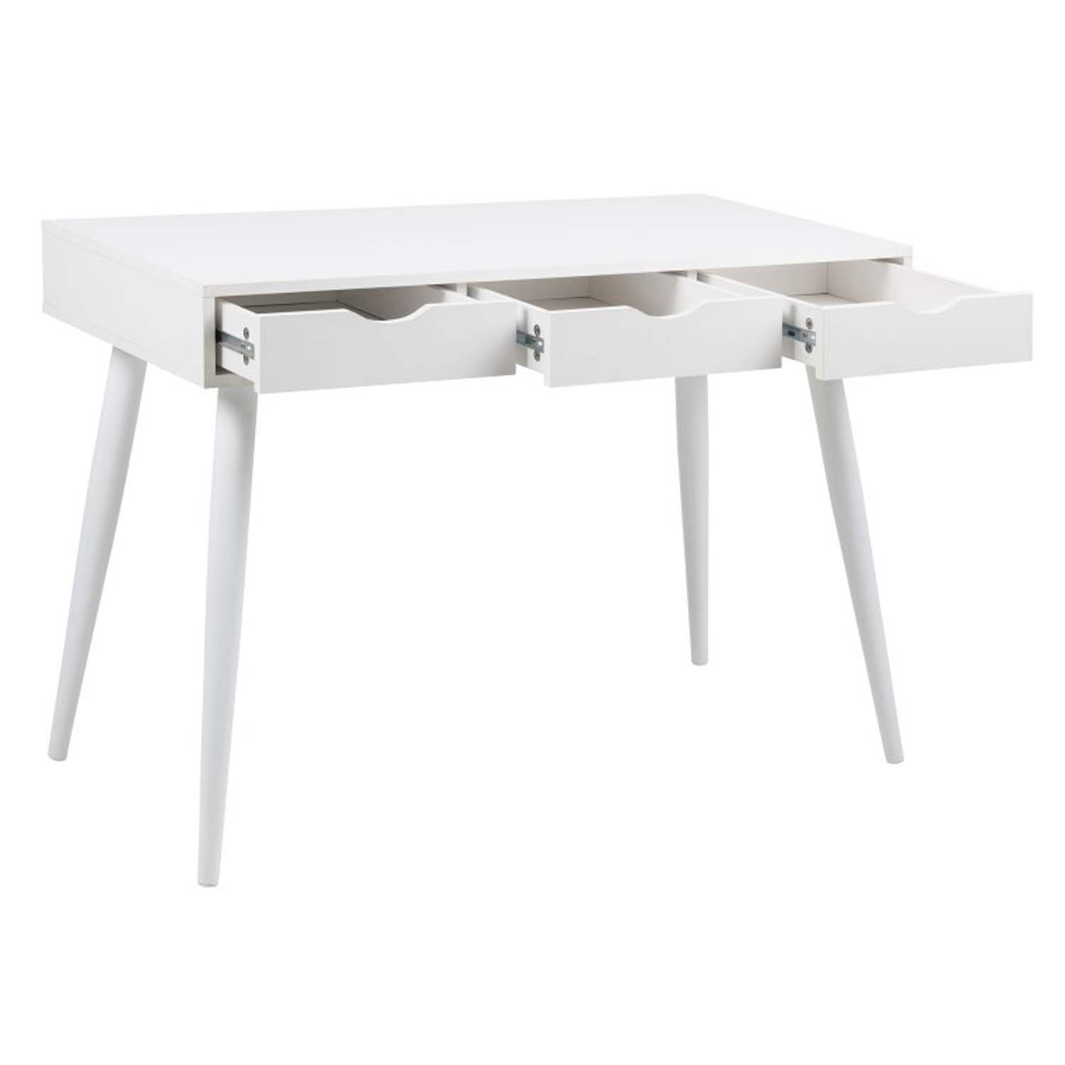 Kirjutuslaud NEPTUN 110x50xH77cm, valge. Kirjutuslaud on vajalik täiendus igas kodus, võimaldades mugavamalt arvutit kasutada või endale praktiline kodukontori ruum luua. Kirjutuslaual on kolm sahtlit, mis on metallsiinidel. Laud on valmistatud melamiinplaadist. Värvus on valge. Toote mõõdud on 110x50xH77cm.