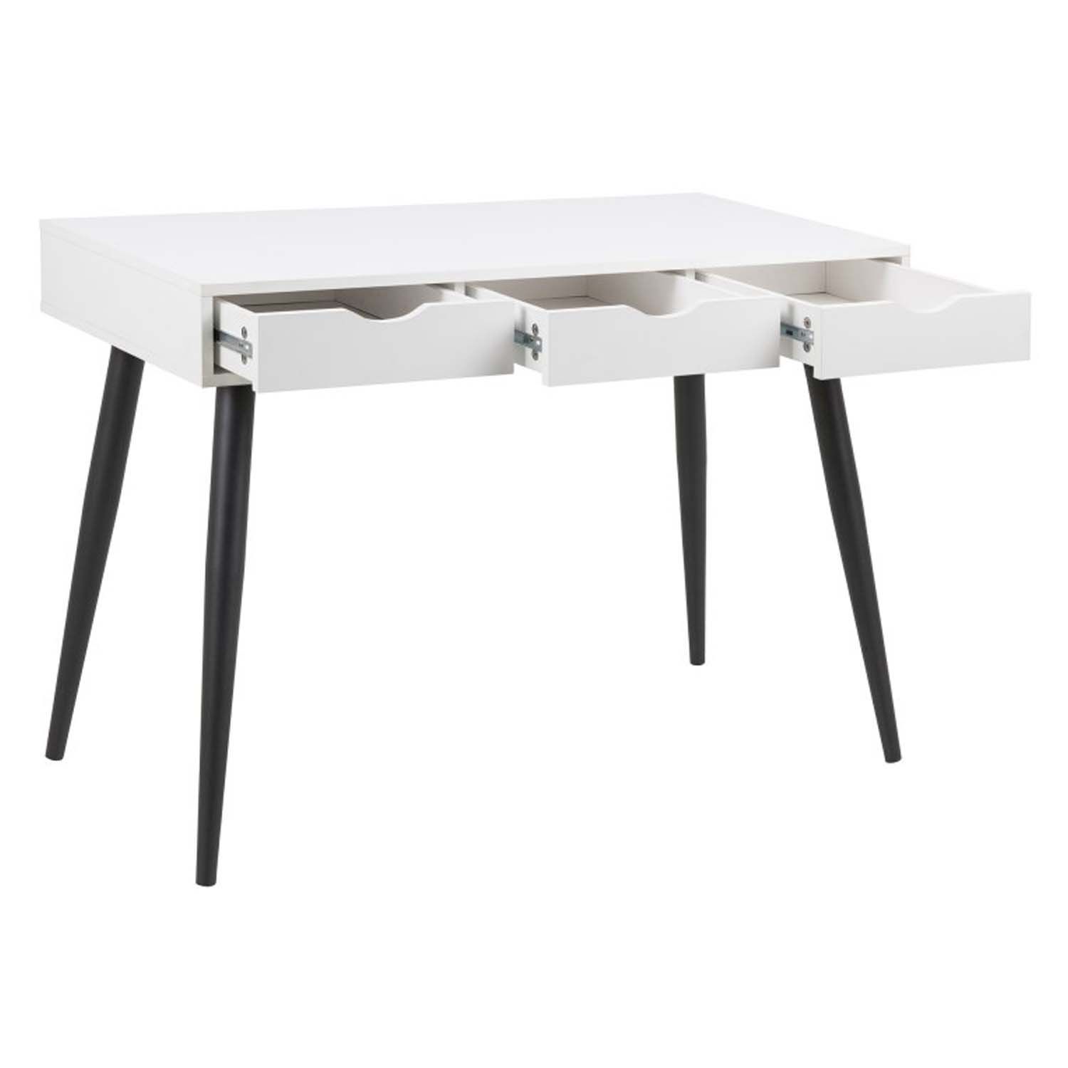 Kirjutuslaud NEPTUN 110x50xH77cm, valge/must. Kirjutuslaud on vajalik täiendus igas kodus, võimaldades mugavamalt arvutit kasutada või endale praktiline kodukontori ruum luua. Kirjutuslaual on kolm sahtlit, mis on metallsiinidel. Laud on valmistatud melamiinplaadist. Värvus on valge. Jalad on valmistatud musta värvi metallist. Toote mõõdud on 110x50xH77cm.