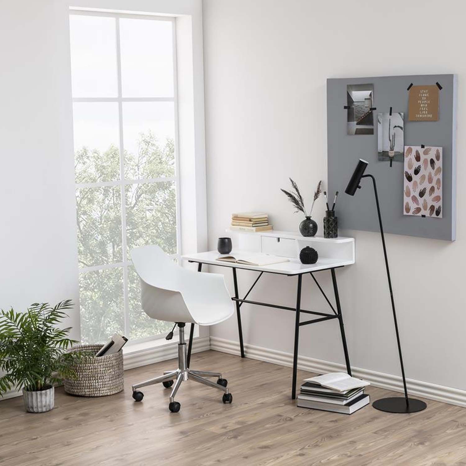 Kirjutuslaud PASCAL 100x55xH88,8cm, valge. Kirjutuslaud on vajalik täiendus igas kodus, võimaldades mugavamalt arvutit kasutada või endale praktiline kodukontori ruum luua. Kirjutuslaud sahtliga ja riiuliga. Lauaplaat on valmistatud MDF-ist. Värvus on matt valge. Jalad on valmistatud musta värvi metallist. Toote mõõdud on 100x55xH88,8cm.