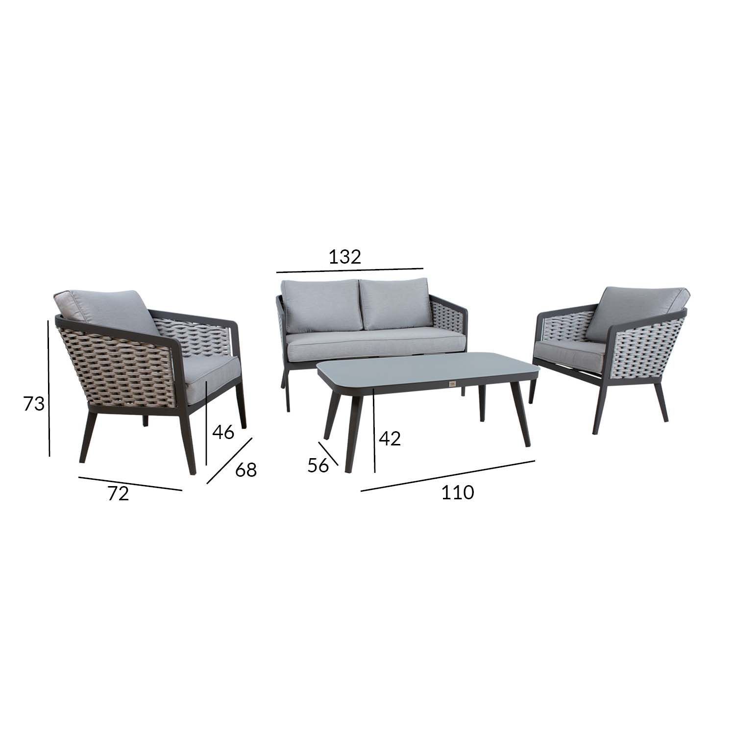 Aiamööblikomplekt MARIE laud, diivan ja 2 tooli, hall. Toolide ja diivani raam on valmistatud alumiiniumist ja viimistletud halli pulbervärviga, seljatoed on kaetud helehalli nöörpunutisega. Padjad kuuluvad komplekti. Padjakatted on valmistatud helehallist olefin kangast. Lauaplaat: 5mm hall dekoorklaas. Mõõdud: laud 110x56xH42cm, tool 68x72x73cm, diivan 132x72xH73cm. Toode on muutlikes ilmastikutingimustes hästi vastupidav ja lihtsalt hooldatav. Kaitset ilmastikuolude eest vajavad ainult padjad. Välitingimustes kasutatava mööbli eluea pikendamiseks soovitame kasutada välimööbli katteid. HOIUSTAMINE: suvehooaja lõppedes soovitame aiamööblit hoiustada siseruumides. Puhastage ja kuivatage mööbel enne hoiule panekut. Kasutage hoiustamiseks kuiva ning hea ventilatsiooniga ruumi.