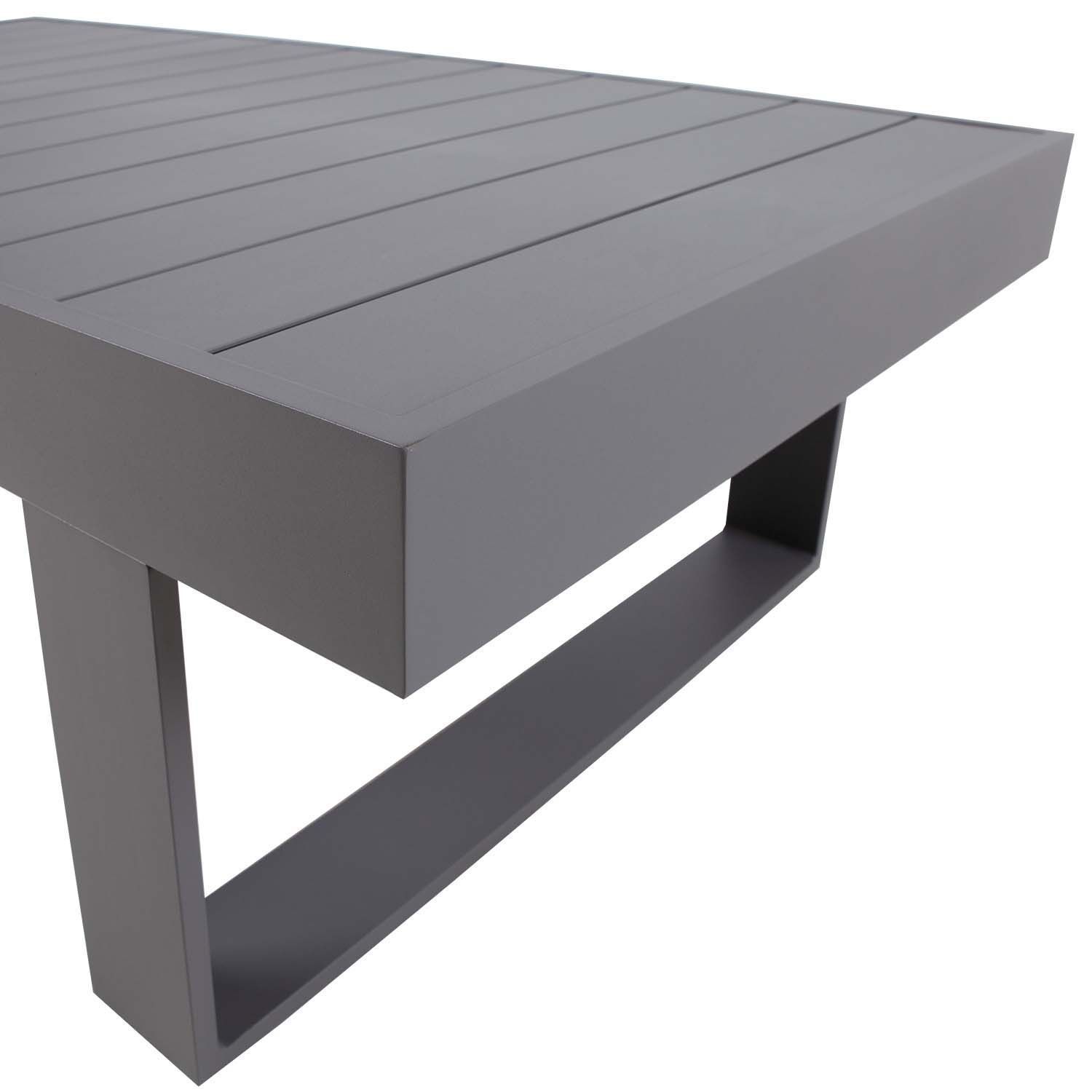 Diivanilaud FLUFFY 133x73,5xH42cm, hall. Lauaplaat ja raam on valmistatud alumiiniumist ja viimistletud halli pulbervärviga. Toode on muutlikes ilmastikutingimustes hästi vastupidav ja lihtsalt hooldatav.