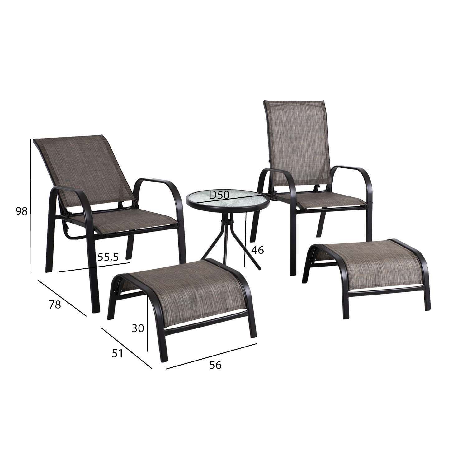 Aiamööblikomplekt DAKOTA laud, 2 reguleeritava seljatoega tooli ja 2 jalapinki. Kõigi komplekti osade raamid on valmistatud terasest ja viimistletud musta pulbervärviga. Tooli iste ja seljatugi ning jalapink on kaetud halli textilene kangaga, mis laseb hästi õhku läbi, kuivab kiiresti ja on lihtsalt puhastatav. Laua mõõdud on D50xH46cm, lauaplaat: 5mm läbipaistev laineline klaas. Tooli mõõdud on 78x55,5xH98cm, jalapingi mõõdud on 56x51xH30cm. Toode on muutlikes ilmastikutingimustes vastupidav ja väga lihtsalt hooldatav. HOIUSTAMINE: suvehooaja lõppedes soovitame aiamööblit hoiustada siseruumides. Puhastage ja kuivatage mööbel enne hoiule panekut. Kasutage hoiustamiseks kuiva ning hea ventilatsiooniga ruumi.