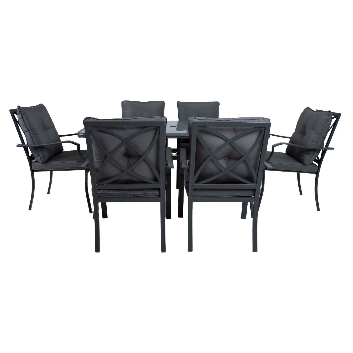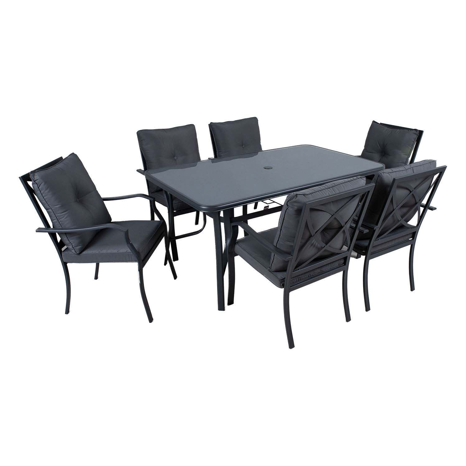 Aiamööblikomplekt BOSLER laud ja 6 tooli. Laua ja toolide raamid on valmistatud terasest ja viimistletud halli pulbervärviga. Laua mõõdud on 150x90xH72cm, lauaplaat: 5mm hall karastatud klaas. Laua keskel on auk päikesevarju jaoks D4cm. Tooli mõõdud on 56x63xH86cm, istme kõrgus raami ääreni 38,5cm. Käetoe kõrgus maast on 62cm. Tooli istmepõhi on kaetud halli textilene kangaga, mis laseb hästi õhku läbi, kuivab kiiresti ja on lihtsalt puhastatav. Pehmed istmepadjad on kaetud halli polüesterkangaga. Istmepadja mõõdud on 48x48xH7cm, seljatoepadja mõõdud on 50x50x15cm. Toolid on virnastatavad. Toode on muutlikes ilmastikutingimustes vastupidav ja väga lihtsalt hooldatav. HOIUSTAMINE: suvehooaja lõppedes soovitame aiamööblit hoiustada siseruumides. Puhastage ja kuivatage mööbel enne hoiule panekut. Kasutage hoiustamiseks kuiva ning hea ventilatsiooniga ruumi.