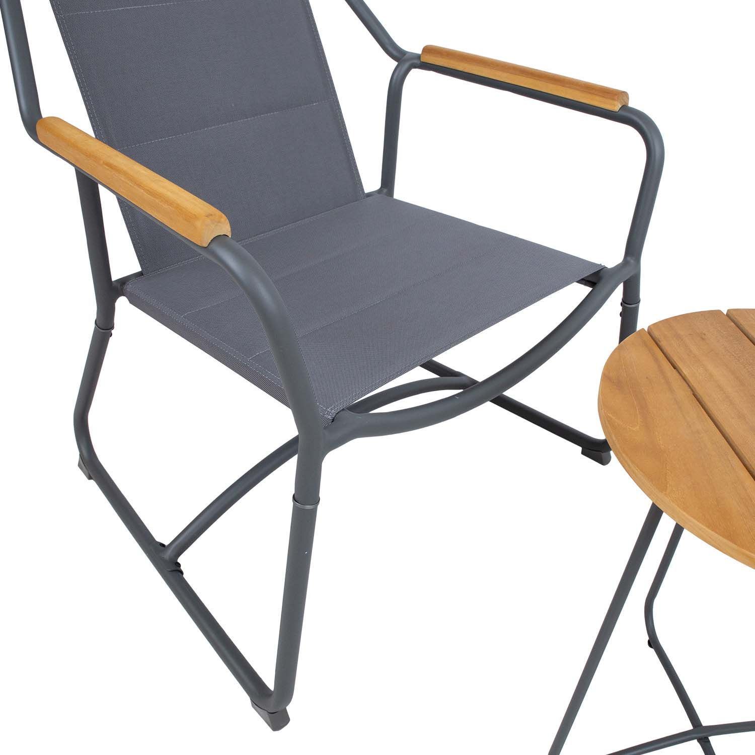 Rõdukomplekt LARISA laud ja 2 tooli. LARISA komplekt on mugav ja praktiline ning sobib hästi rõdule, aeda või sauna eesruumi. Toolide ja laua raamid on valmistatud alumiiniumist ja viimistletud tumehalli pulbervärviga. Kerge vahtpolstriga textiline istmed, kuivavad kiiresti ja neid on lihtne puhastada. Tiigipuust lauaplaat ja liistud toolide käetugedel lisavad komplektile omanäolise aktsendi. Laua mõõdud D40xH50cm. Tooli mõõdud 74x75xH85cm, kaalupiirang 110kg. Kasutatud puidul on FSC sertifikaat. Toode on muutlikes ilmastikutingimustes vastupidav ja väga lihtsalt hooldatav. Välitingimustes kasutatava mööbli eluea pikendamiseks soovitame kasutada välimööbli katteid. HOIUSTAMINE: suvehooaja lõppedes soovitame aiamööblit hoiustada siseruumides. Puhastage ja kuivatage mööbel enne hoiule panekut. Kasutage hoiustamiseks jahedat, kuiva ning hea ventilatsiooniga ruumi.