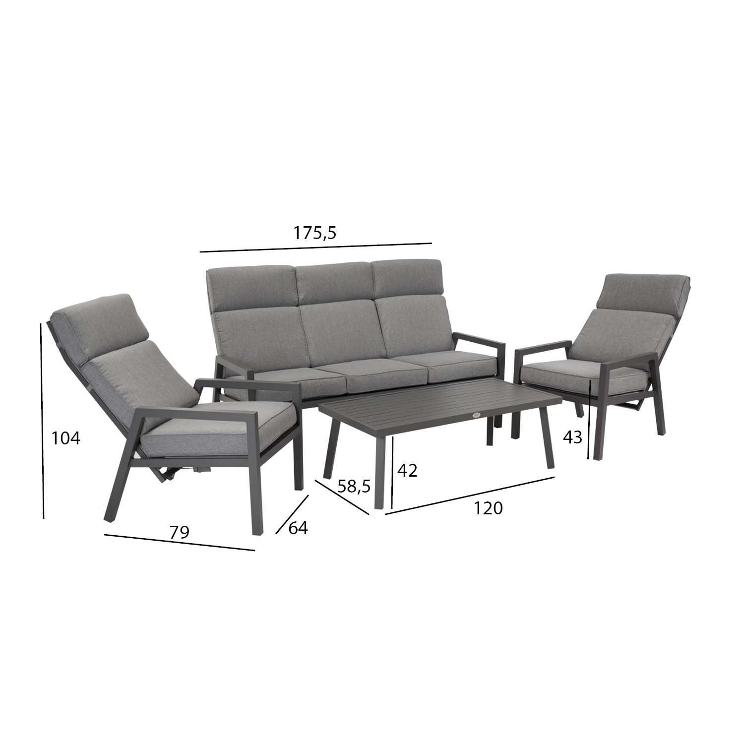 Aiamööblikomplekt CASPER laud, diivan ja 2 tooli. Kõigi komplekti osade põhikonstruktsioon ja lauaplaat on valmistatud alumiiniumist ja viimistletud halli pulbervärviga. Textilene kangast istmed ja seljatoed lasevad hästi õhku läbi, kuivavad kiiresti ja neid on lihtne puhastada. Pehmed istmepadjad kuuluvad komplekti. Tugitoolide seljatoed on reguleeritavad. Reguleerimiskang asub paremal käel, istme ääre all. Laua mõõdud on 120x58,5xH42cm. Diivani mõõdud 175,5x79xH104cm. Tugitooli mõõdud 64x79xH104cm. Padjakatted on valmistatud hallist polüesterkangast. Istmepatjade paksus 10cm, seljatoepatjade paksus 8cm. Toode on muutlikes ilmastikutingimustes hästi vastupidav ja lihtsalt hooldatav. Kaitset ilmastikuolude eest vajavad ainult padjad. Hea lahendus patjade igapäevaseks hoiustamiseks ja kuivana hoidmiseks on padjakast. Välitingimustes kasutatava mööbli eluea pikendamiseks soovitame kasutada välimööbli katteid. HOIUSTAMINE: suvehooaja lõppedes soovitame aiamööblit hoiustada siseruumides. Puhastage ja kuivatage mööbel enne hoiule panekut. Kasutage hoiustamiseks kuiva ning hea ventilatsiooniga ruumi.