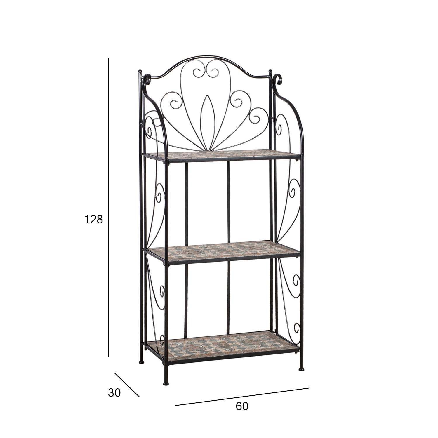 Riiul MOSAIC 60x30xH128cm. Riiulil on 3 tasandit. Riiuli mosaiikplaadid on kaunistatud pruunides ja hallides toonides keraamiliste plaatidega. Metallist alusraam ja jalad on viimistletud musta pulbervärviga.