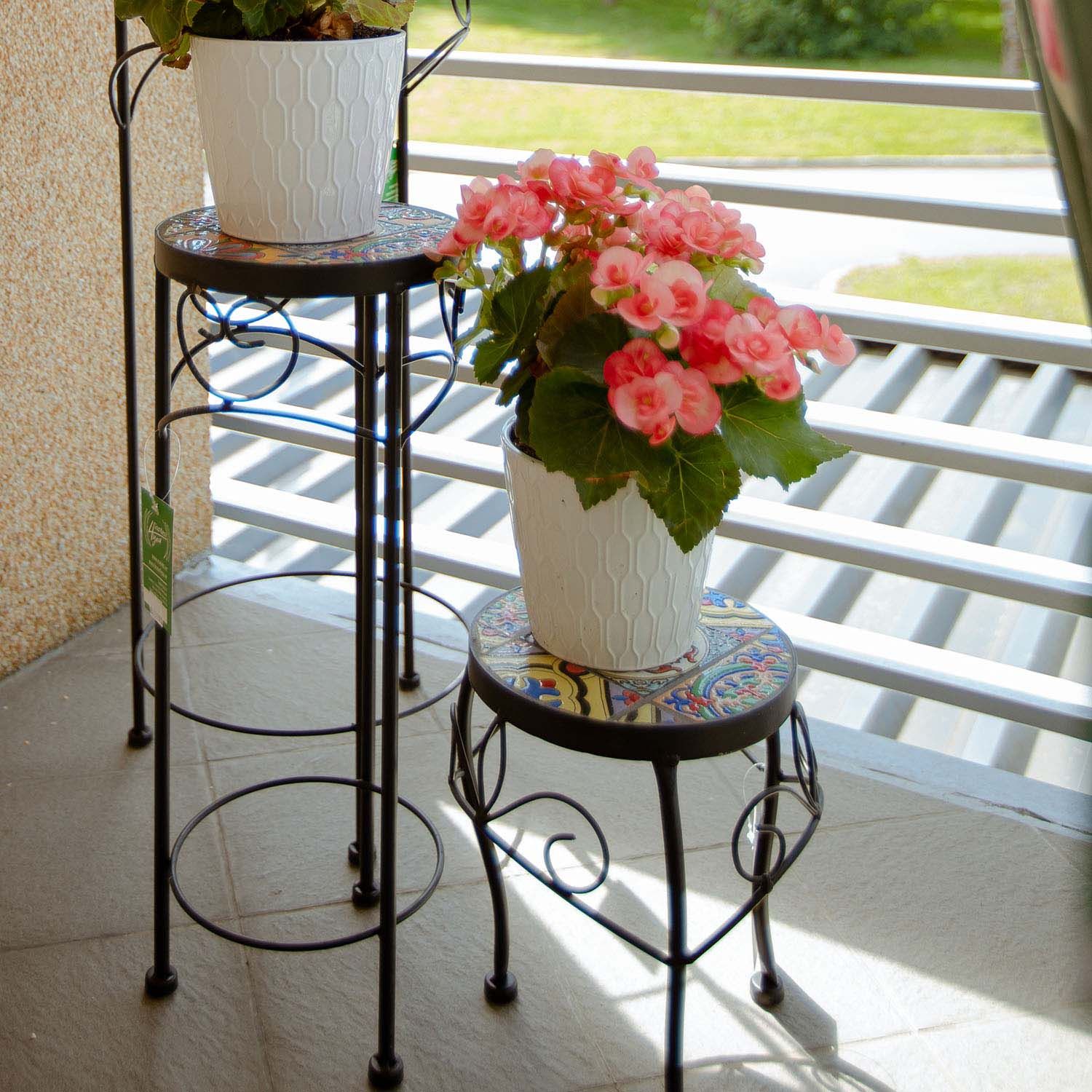Lillepostament MOROCCO D20xH25cm. Pealmine mosaiikplaat on kaetud Morocco stiilis värviliste keraamiliste plaatidega. Metallist alusraam ja jalad on viimistletud musta pulbervärviga. Toode sobib kasutamiseks nii sise- kui väli tingimustes.