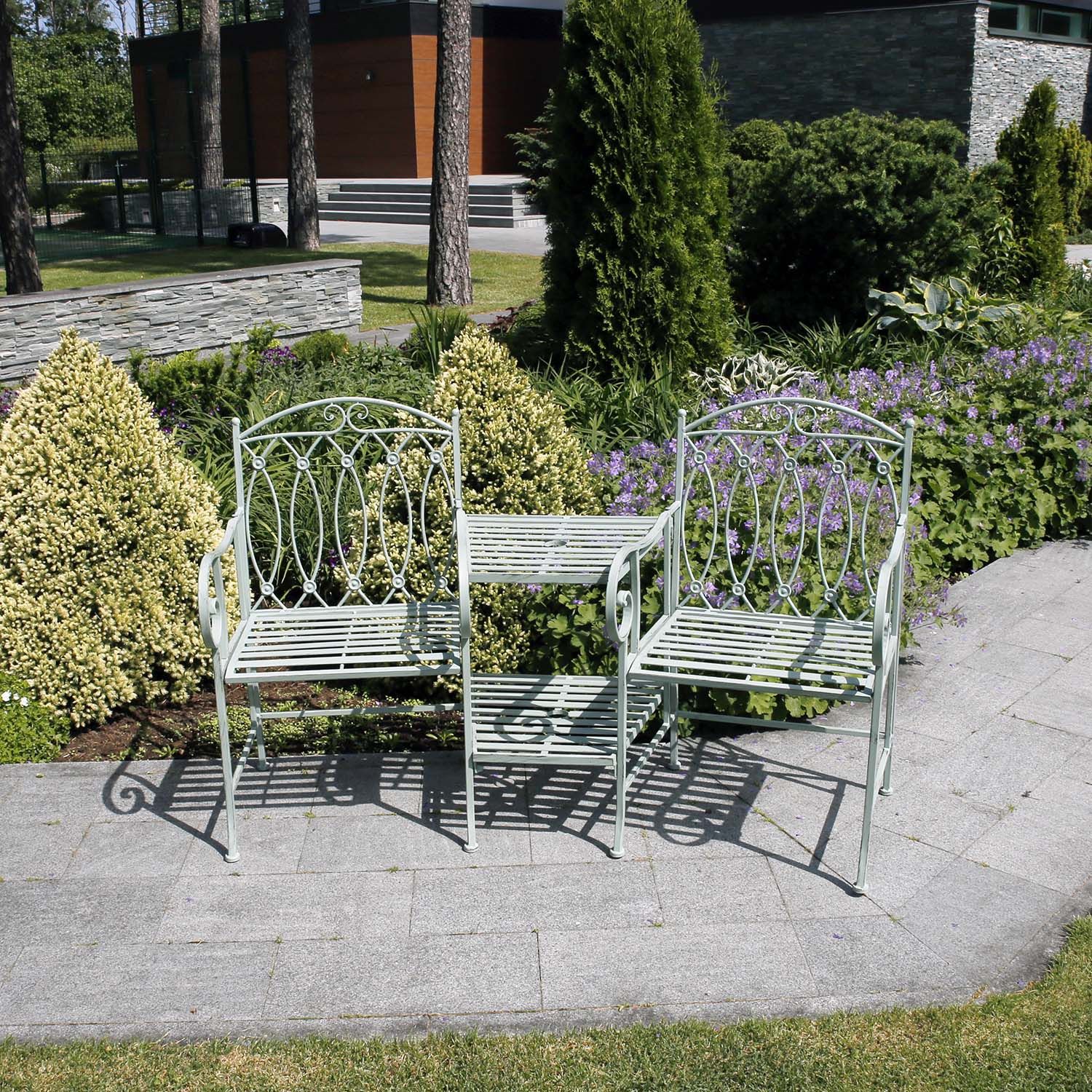 Pink MINT abilauaga 155x68,5x91,5cm, antiikroheline. Sepistatud metallist mööbel on stiilne ja vastupidav! Toote viimistlemisel on kasutatud kombineerituna elektroforeeskatet ja pulbervärvi, mis tagab väga hea roostekindluse. Kahe istme vahel on kahetasandiline abilaud, mille keskele on võimalik paigaldada päikesevari. Päikesevarju augu läbimõõt on 4,5cm. Ühe istme laius on 53,5cm, istme sügavus 43cm, istme kõrgus 40cm. Lauaplaadi mõõdud on 31/48x46cm. Kaalupiirang ühel istmekohal 100kg. HOOLDUS JA HOIUSTAMINE: metallist mööbel on praktiliselt hooldusvaba, piisab regulaarsest puhastamisest. Suvehooaja lõppedes soovitame aiamööblit hoiustada siseruumides. Puhastage ja kuivatage mööbel enne hoiule panekut. Kasutage hoiustamiseks kuiva ning hea ventilatsiooniga ruumi.