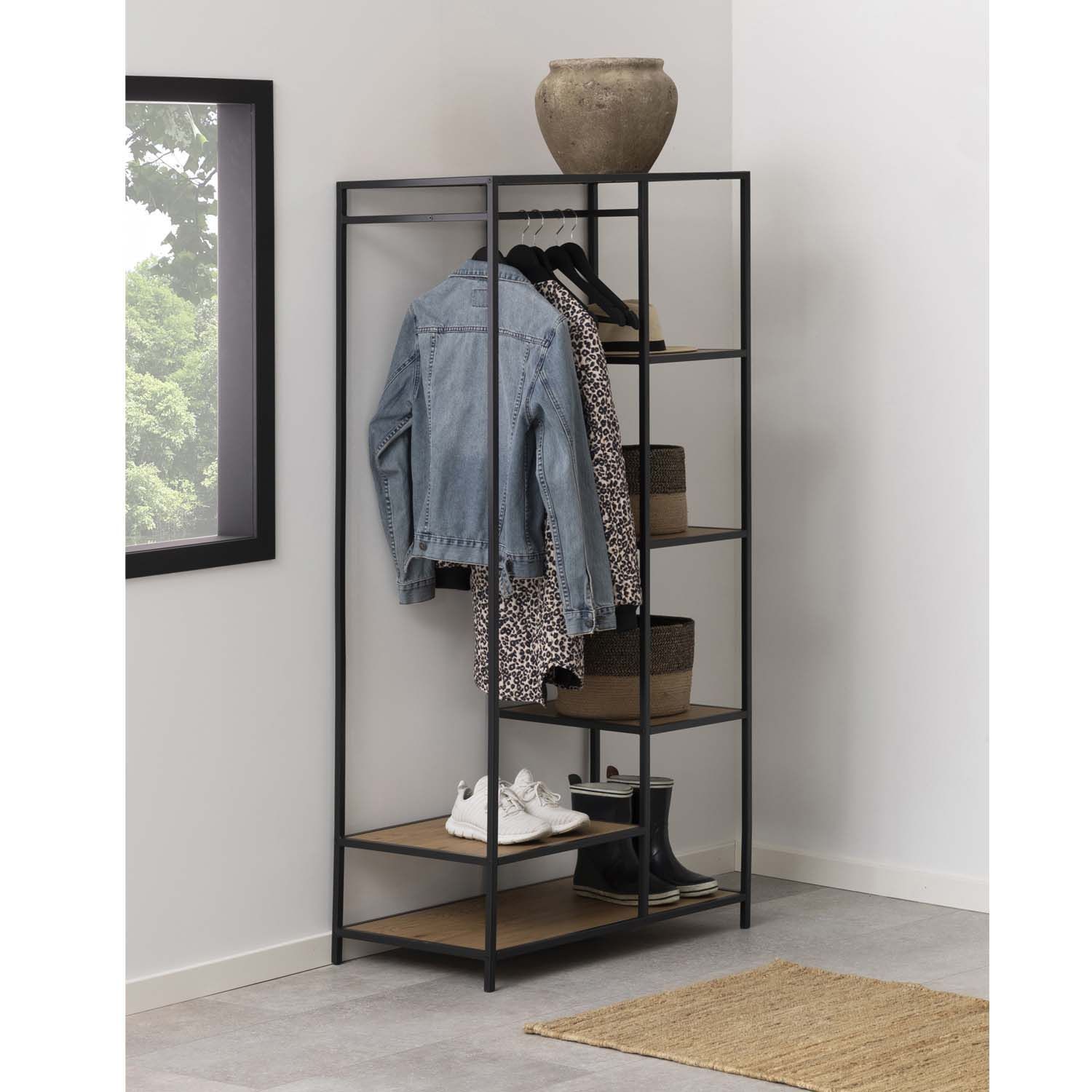 Esikunagi SEAFORD 77x45xH165cm. Riidenagi sobib suurepäraselt igasse ruumi. Sellel on isikupära, mis sobib paljude sisustusstiilidega. Puiduefekti toetab pulbervärvitud metallalus. Hoolikalt valitud materjalidest riidenagi on lihtne hooldada. 5 riiuliga ja riidepuu toruga. Riiulid: MDF/melamiin, värvus on metsik tamm. Raam on valmistatud musta värvi metallist. Riiulite kandejõud 23kg. HOOLDUS: Kasutage igapäevaseks puhastamiseks seebiveest kuivaks väänatud lappi. Rooste vältimiseks pühkige pind lapiga kuivaks. Ärge hõõruge pinda kõvade esemetega.
