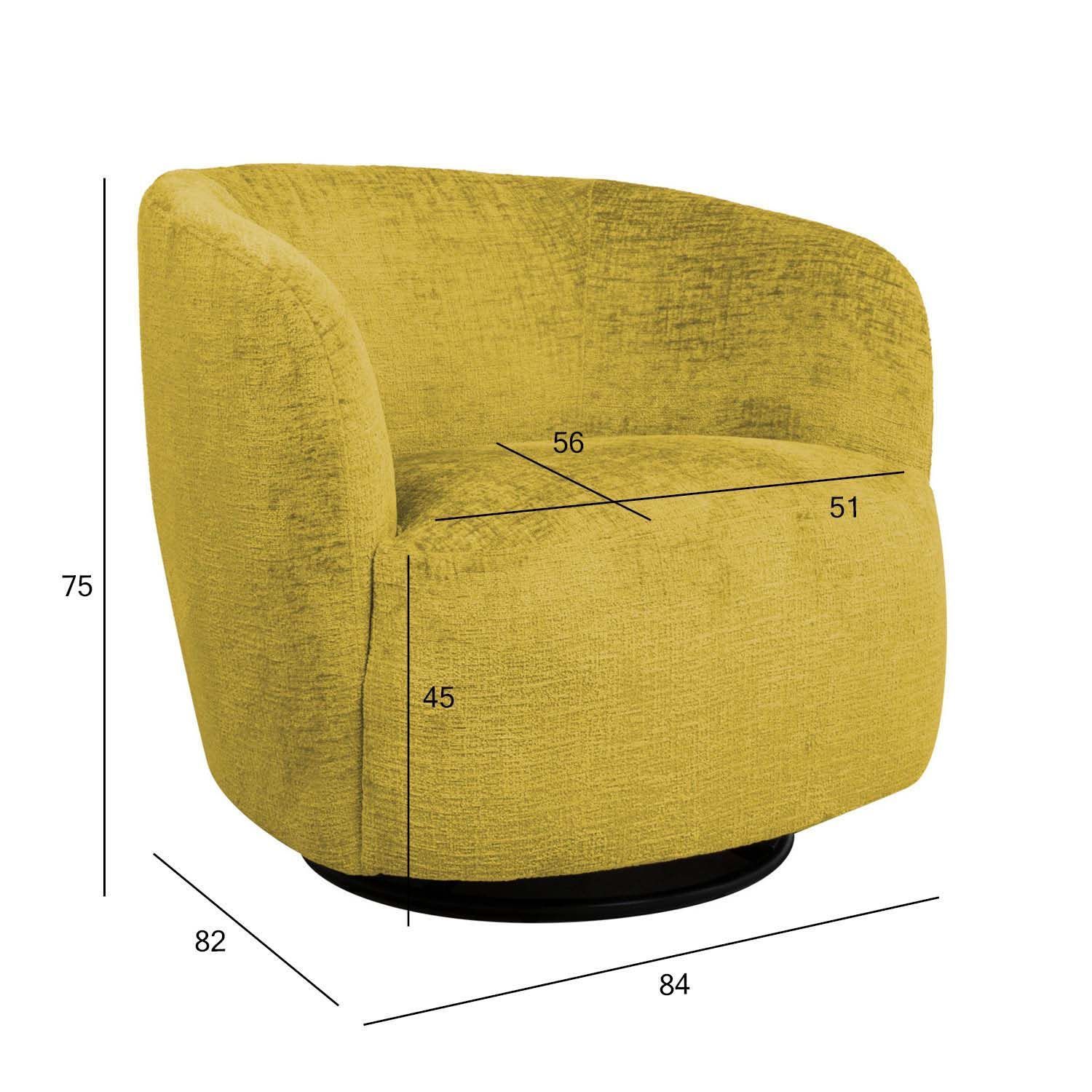 Tugitool MANUELA kollane. Ümara vormiga 360° pöörlev tugitool on mugav ja funktsionaalne ning sobitub suurepäraselt nii koju kui kontorisse. Istme karkass on valmistatud puidust ja vineerist. Istme sees on pocket vedruplokk. Polsterduseks on kasutatud polüuretaanvahtu ja polüesterkiudu. Kattematerjal on polüesterkangas, Martindale väärtus 41 000. Tooli üldmõõdud on 84x82xH75cm. Istme laius 51cm, istme sügavus 56cm, istme kõrgus 45cm.