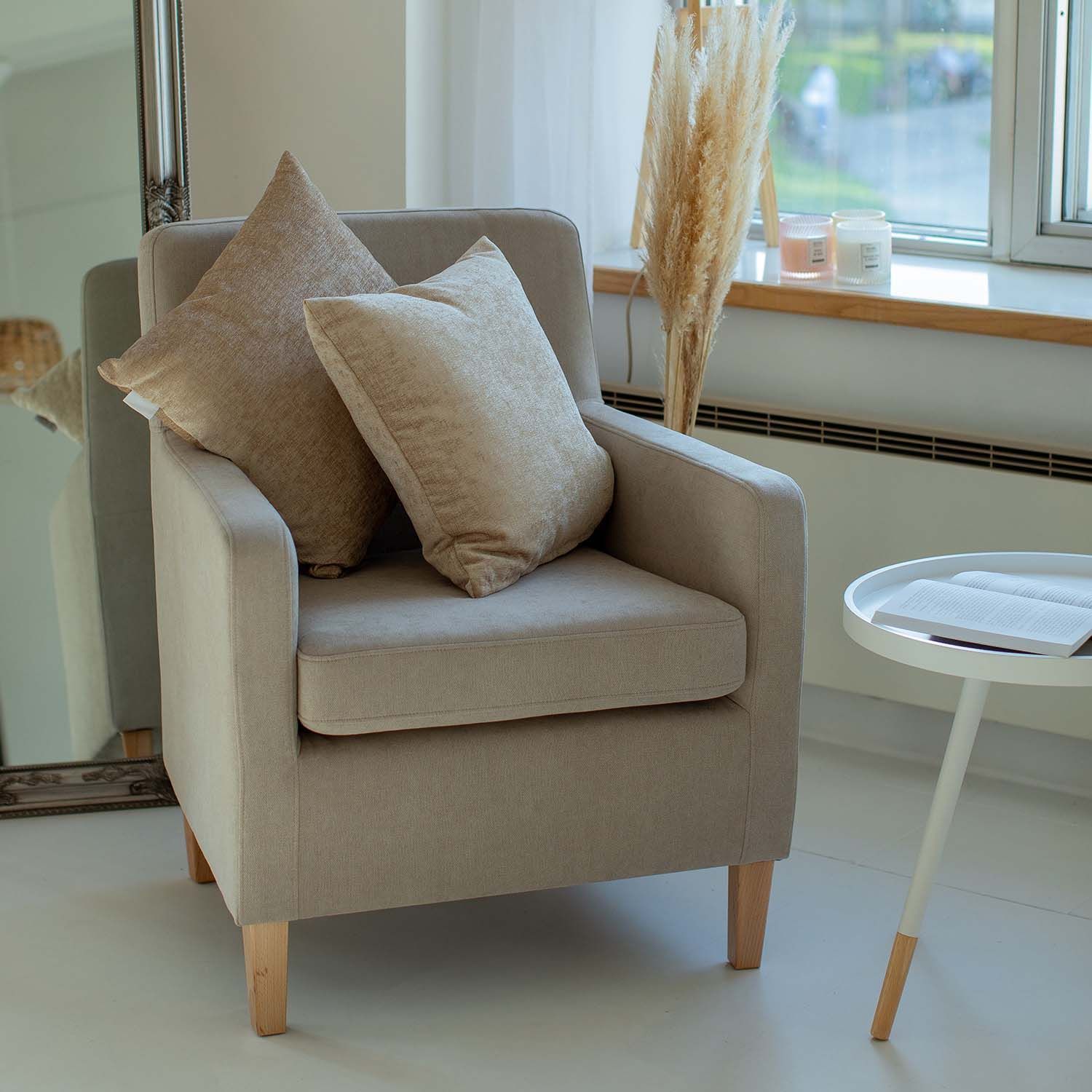 Tugitool LEENE beež. Istmepadi on kaetud 130g/m2 polüesterkangaga, Martindale 40 000. Kate on eemaldatav. Istmepadi on valmistatud 100mm 35kg/m3 poroloonist. Tugitooli karkass on valmistatud puidust, vineerist, puitkiud- ja puitlaastplaadist. Raam on kaetud porolooniga. Toolil on siksak vedrustus. Toolil on neli kasepuidust jalga, mille kõrgus on 14cm. Käetugede laius on 8cm. Istme kõrgus on 45cm, istme laius 52,5cm, istme sügavus 55,5cm. Tooli kaalupiirang on 130kg. Toote mõõdud on 68,5x76xH84cm. Toode on valmistatud EL-is.