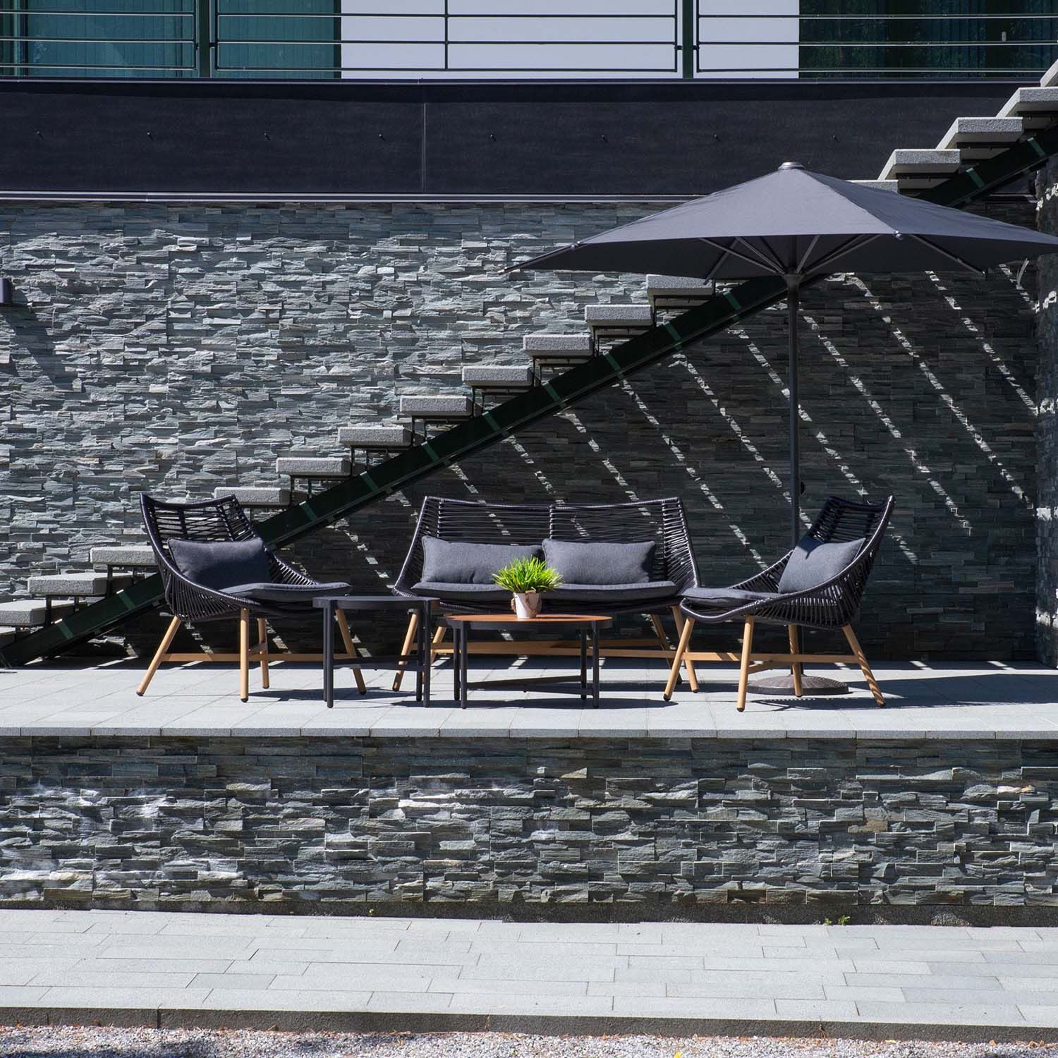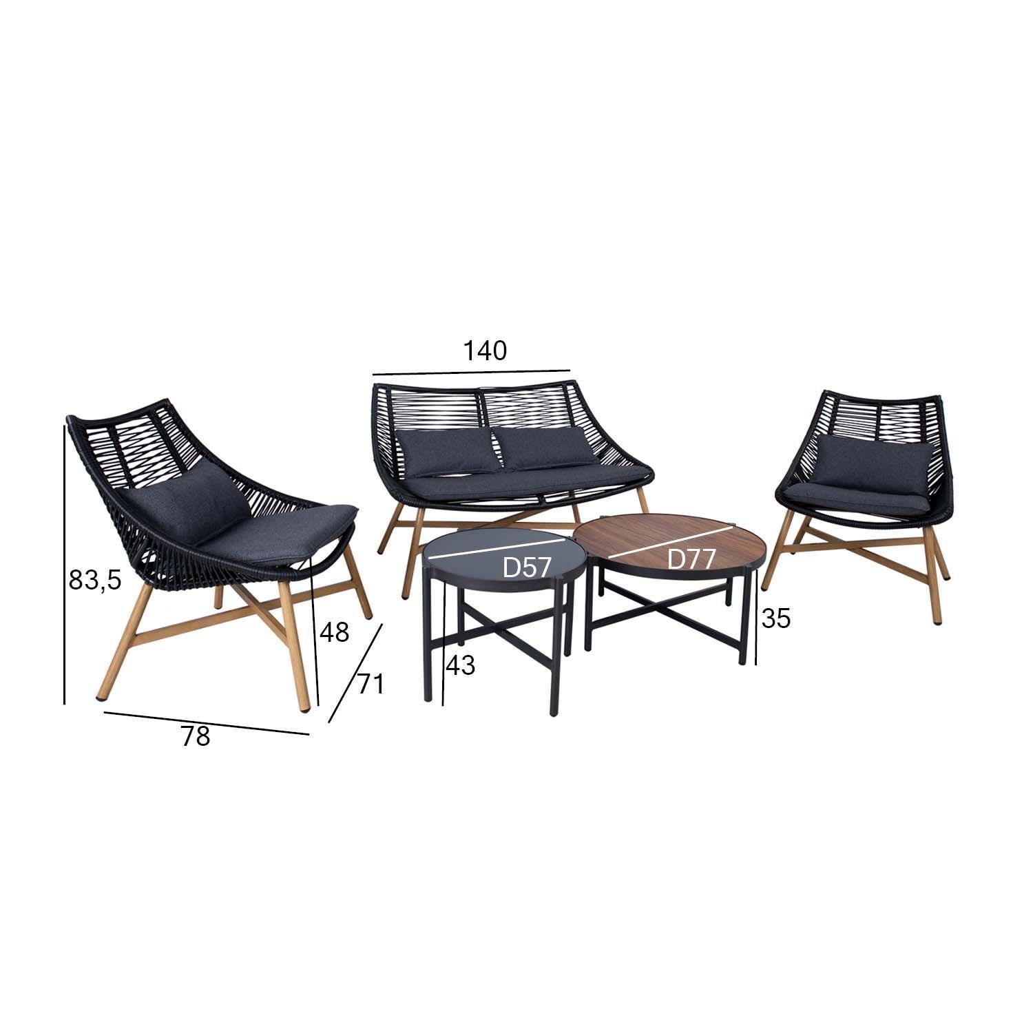 Aiamööblikomplekt HELSINKI diivan, 2 tooli ja 2 lauda. Komplekti kõigi osade jalad ja raamid on valmistatud alumiiniumist. Diivani ja toolide istmed on kaetud musta plastikpunutisega, jalad ja alusraam on käsitsi värvitud tiikpuud meenutava beeži värviga. Istmepadjad kuuluvad komplekti. Padjakatted on valmistatud tumehallist polüesterkangast. Laudade jalad ja alusraam on viimistletud tumehalli pulbervärviga. Suurem lauaplaat: tiikpuu dekooriga ilmastikukindel kõrgsurvelaminaat. Väiksema lauaplaat: hall karastatud klaas. Diivani mõõdud on 140x78xH83,5cm, tooli mõõdud on 71x78xH83,5cm, laudade mõõdud on D77xH35cm, D57xH43cm. Toode on muutlikes ilmastikutingimustes hästi vastupidav ja lihtsalt hooldatav. Kaitset ilmastikuolude eest vajavad ainult padjad. Välitingimustes kasutatava mööbli eluea pikendamiseks soovitame kasutada välimööbli katteid. HOIUSTAMINE: suvehooaja lõppedes soovitame aiamööblit hoiustada siseruumides. Puhastage ja kuivatage mööbel enne hoiule panekut. Kasutage hoiustamiseks kuiva ning hea ventilatsiooniga ruumi.