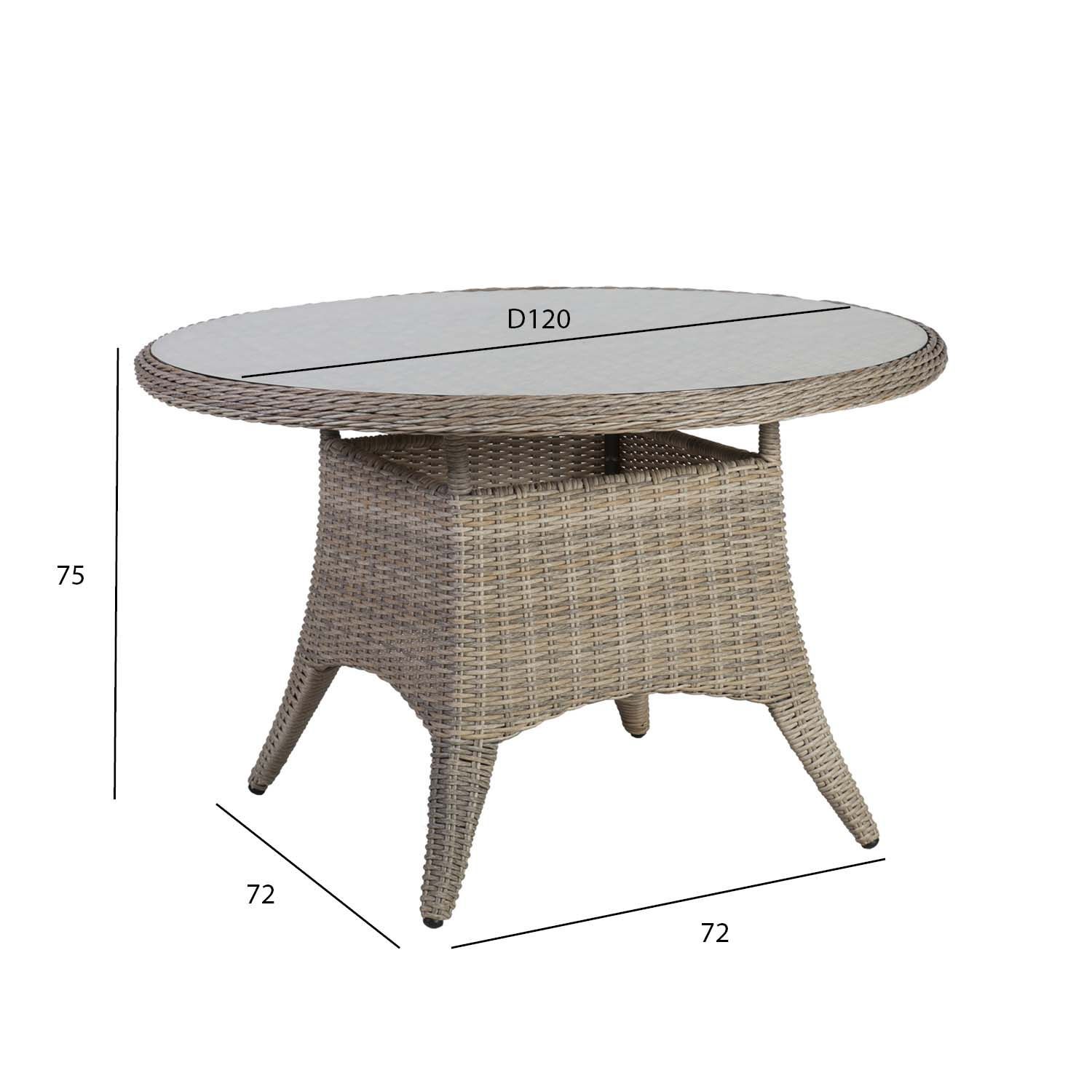Laud PACIFIC D120xH75cm. Lauaplaat on valmistatud 5mm paksusest karastatud läbipaistvast klaasist. Laual on alumiiniumraam plastikpunutisega, värvus: hallikasbeež. Toode on ilmastikukindel. Välitingimustes kasutatava mööbli eluea pikendamiseks soovitame kasutada välimööbli katteid. HOIUSTAMINE: suvehooaja lõppedes soovitame aiamööblit hoiustada siseruumides. Puhastage ja kuivatage mööbel enne hoiule panekut. Kasutage hoiustamiseks jahedat, kuiva ning hea ventilatsiooniga ruumi.