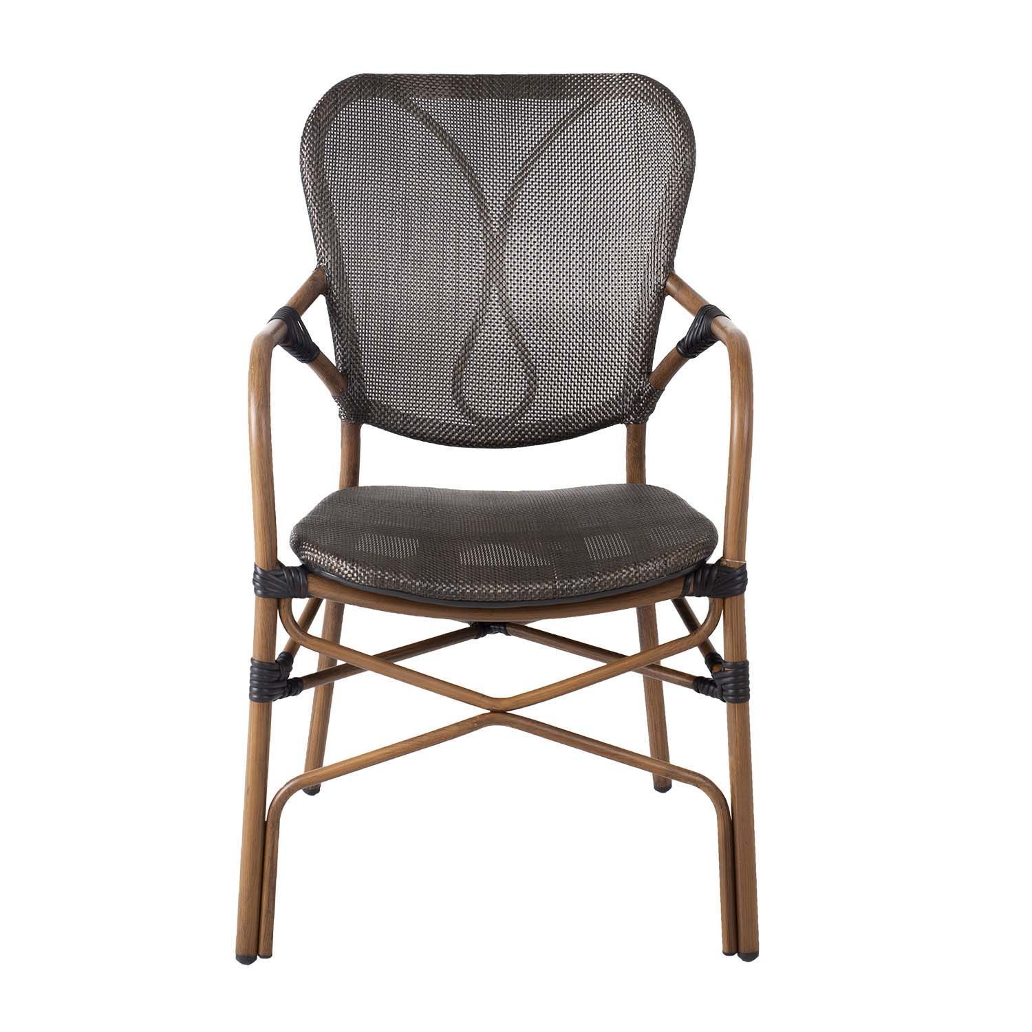 Tool BAMBUS käetugedega 55x62xH92,5cm, tumepruun. Prantsuse bistroo stiilist inspireeritud mugav ja vastupidav tool on suurepärane valik koduaeda või kohvikusse. Tool sobib hästi ka siseruumides kasutamiseks. Tooli raam on valmistatud alumiiniumist ja viimistletud bambust meenutava pruuni pulbervärviga. Alumiiniumtoru mõõdud on D28x1,5mm. Iste ja seljatugi on kaetud pruuni textilenega, mis laseb hästi õhku läbi ja kuivab kiiresti. Tooli üldmõõdud on 55x62xH92,5cm, istme laius 46cm, istme sügavus 45cm, istme kõrgus 47cm, seljatoe kõrgus 52cm. Käetoe kõrgus maast 67cm. Kaalupiirang 120kg. Toolid on virnastatavavad ning nende hoiustamine on lihtne ja ruumisäästev. Toode on muutlikes ilmastikutingimustes hästi vastupidav ja lihtsalt hooldatav.