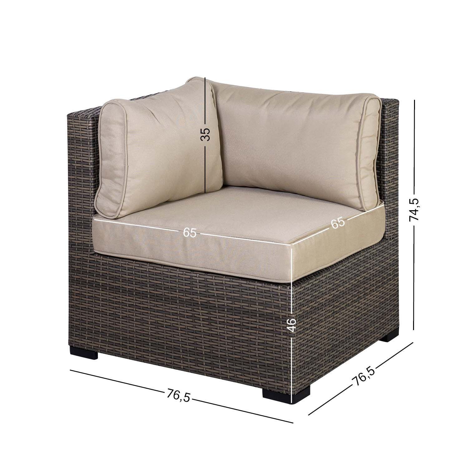 Diivani nurgamoodul SEVILLA 76,5x76,5xH74,5cm, tumepruun. Mooduldiivan on suurepärane võimalus luua sobiva kuju ja suurusega istumiskoht, mida on lihtne muuta ja ümber paigutada. Diivani raam on valmistatud alumiiniumist ja kaetud plastikpunutisega. Padjad kuuluvad komplekti. Padjakatted on valmistatud beežist polüesterkangast. Toode on muutlikes ilmastikutingimustes hästi vastupidav ja lihtsalt hooldatav. Kaitset ilmastikuolude eest vajavad ainult padjad. Välitingimustes kasutatava mööbli eluea pikendamiseks soovitame kasutada välimööbli katteid. HOIUSTAMINE: suvehooaja lõppedes soovitame aiamööblit hoiustada siseruumides. Puhastage ja kuivatage mööbel enne hoiule panekut. Kasutage hoiustamiseks kuiva ning hea ventilatsiooniga ruumi.
